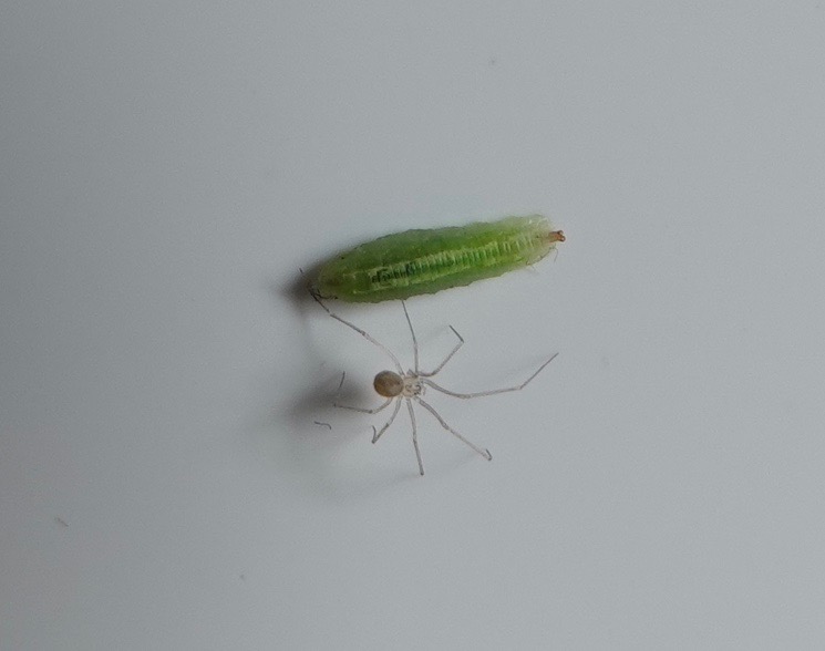 Pholcus genus spider with something else alive. Actually, this larval (?) may have got the better of the contact: the next day, two spider legs were still attached to it, and it moved several inches.