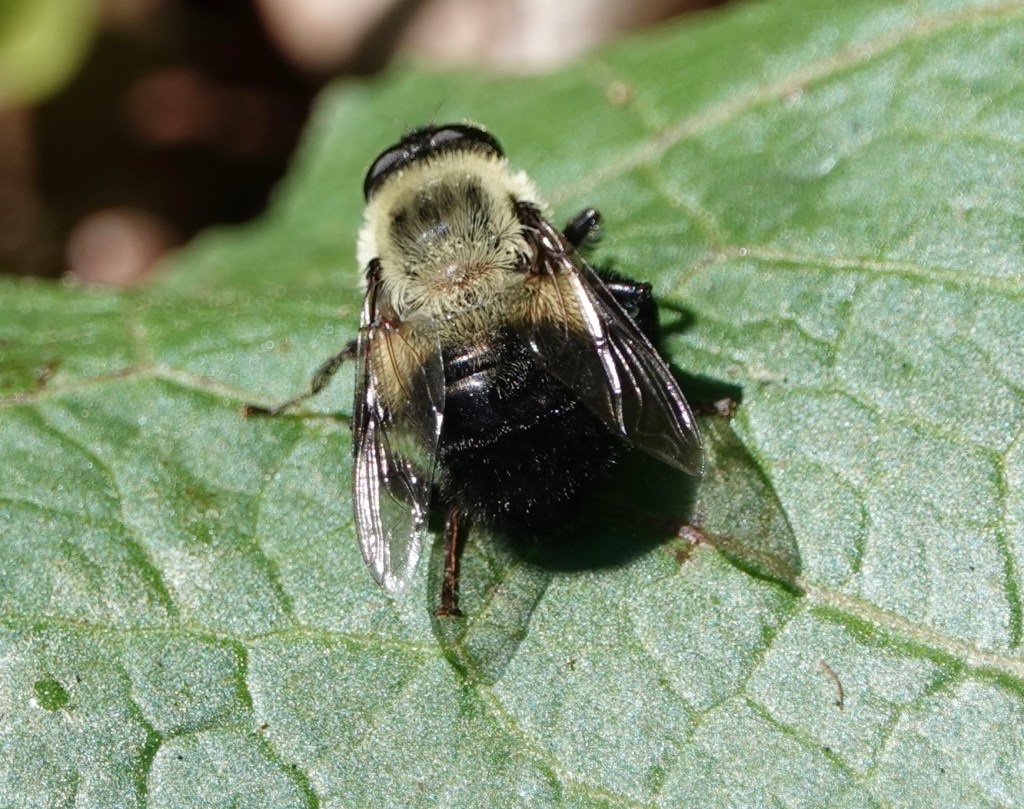 At first glance, you might think this was a small bumble bee. I did, and this isn’t my first bumble rodeo. But look at those eyes. In front of the face, not on the side like a bee. And the eyes are touching: this is a fly, a bumblebee-mimicking fly. Possible Merodon genus.