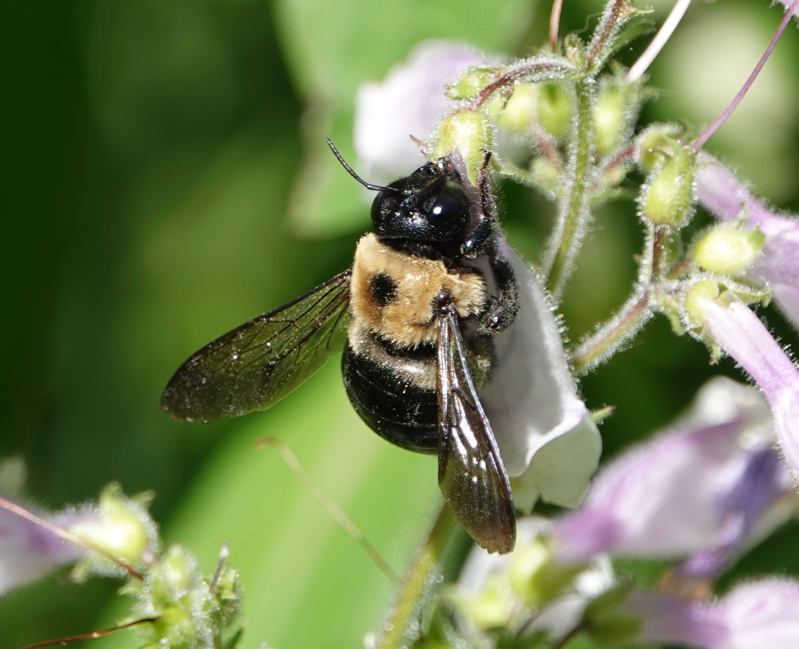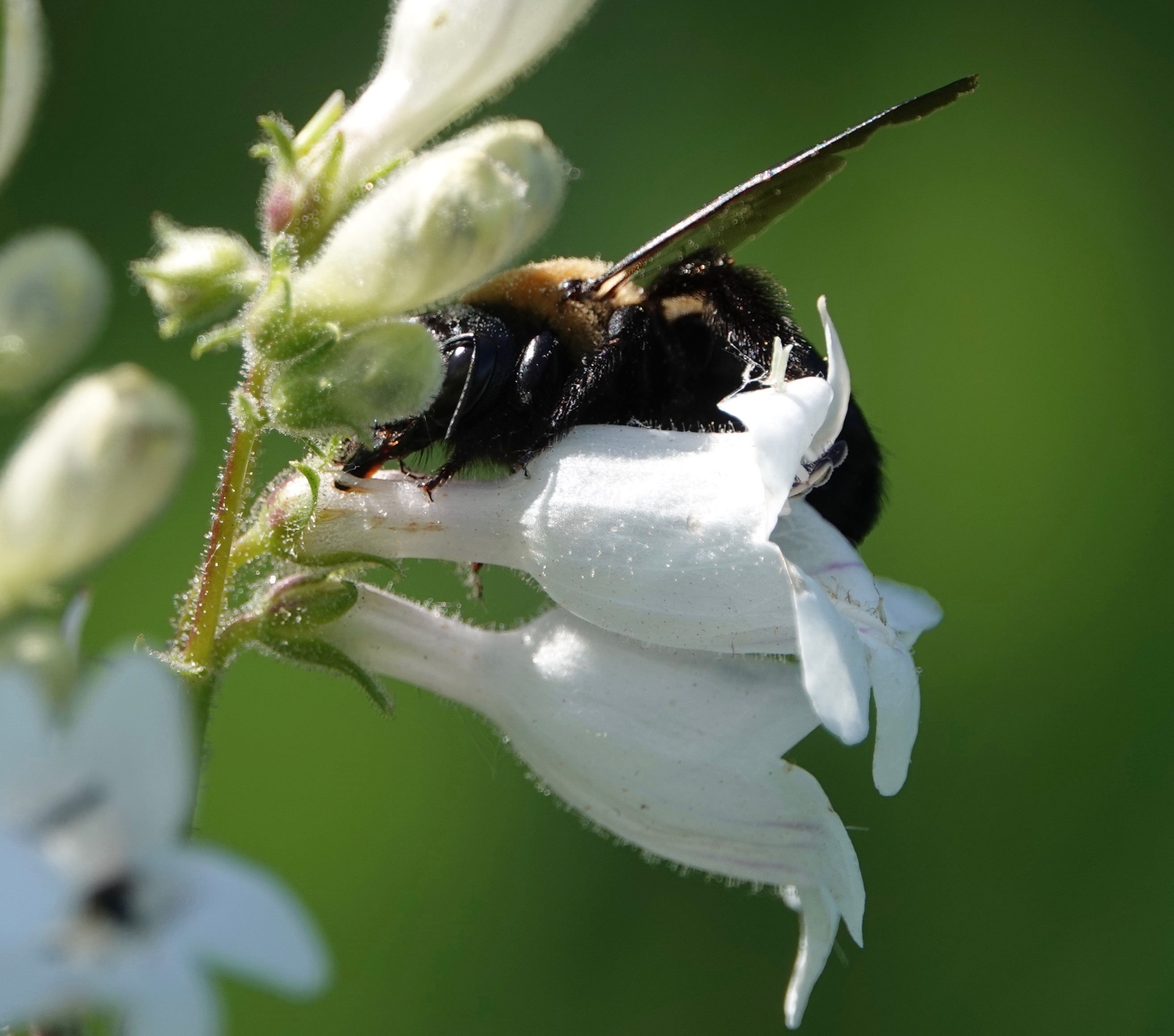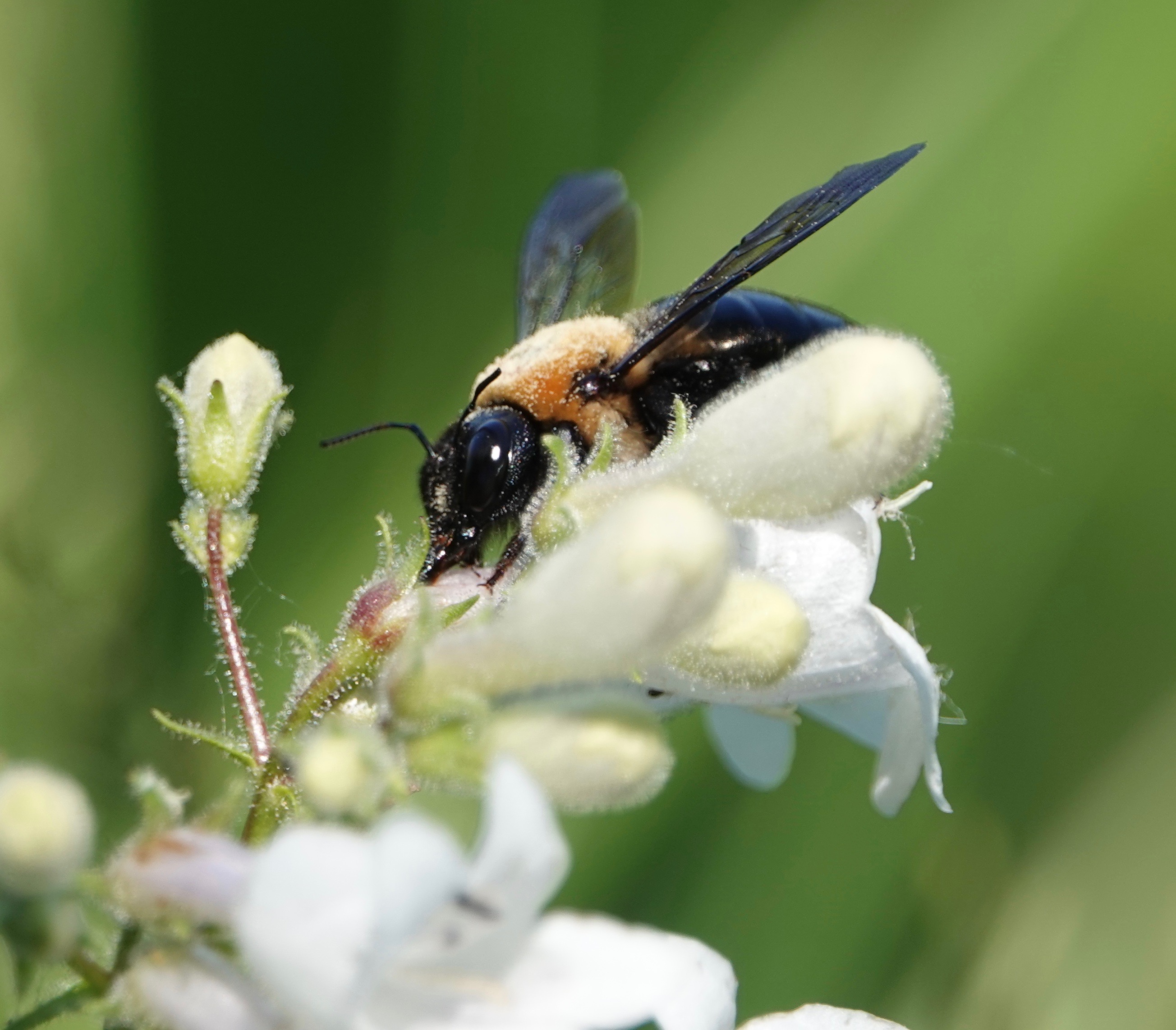 Bee species can be divided up by tongue-size. The Eastern Carpenter Bee, pictured here, is one of our largest bees. But it doesn’t have a big tongue to go with that body size.