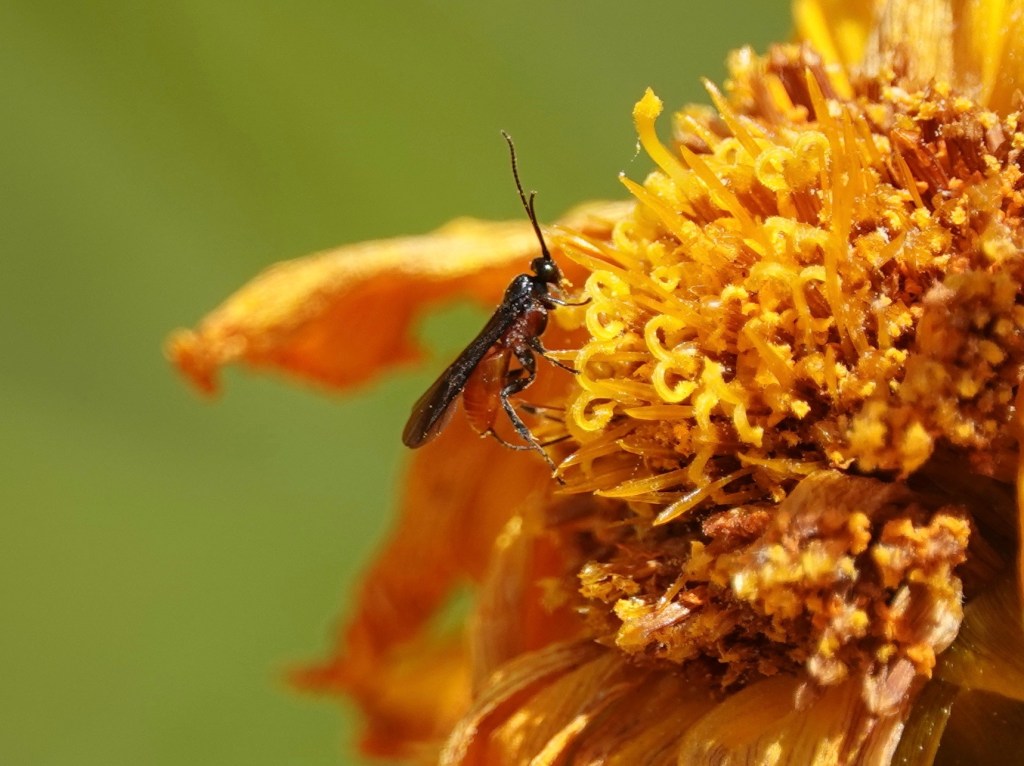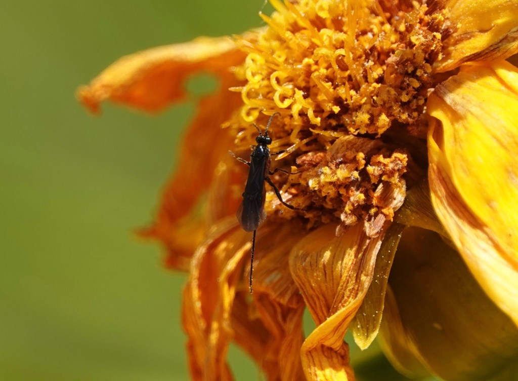 I don’t know what this tiny one is, but what she’s doing is laying her eggs in an old coreopsis with her body-length ovipositor. Is she searching for something to parasitize down there? Note the pollen on her ovipositor.