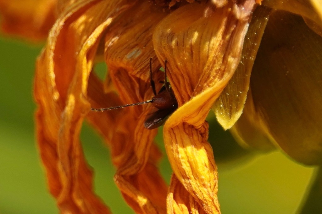 I don’t know what this tiny one is, but what she’s doing is laying her eggs in an old coreopsis with her body-length ovipositor. Is she searching for something to parasitize down there? Note the pollen on her ovipositor.