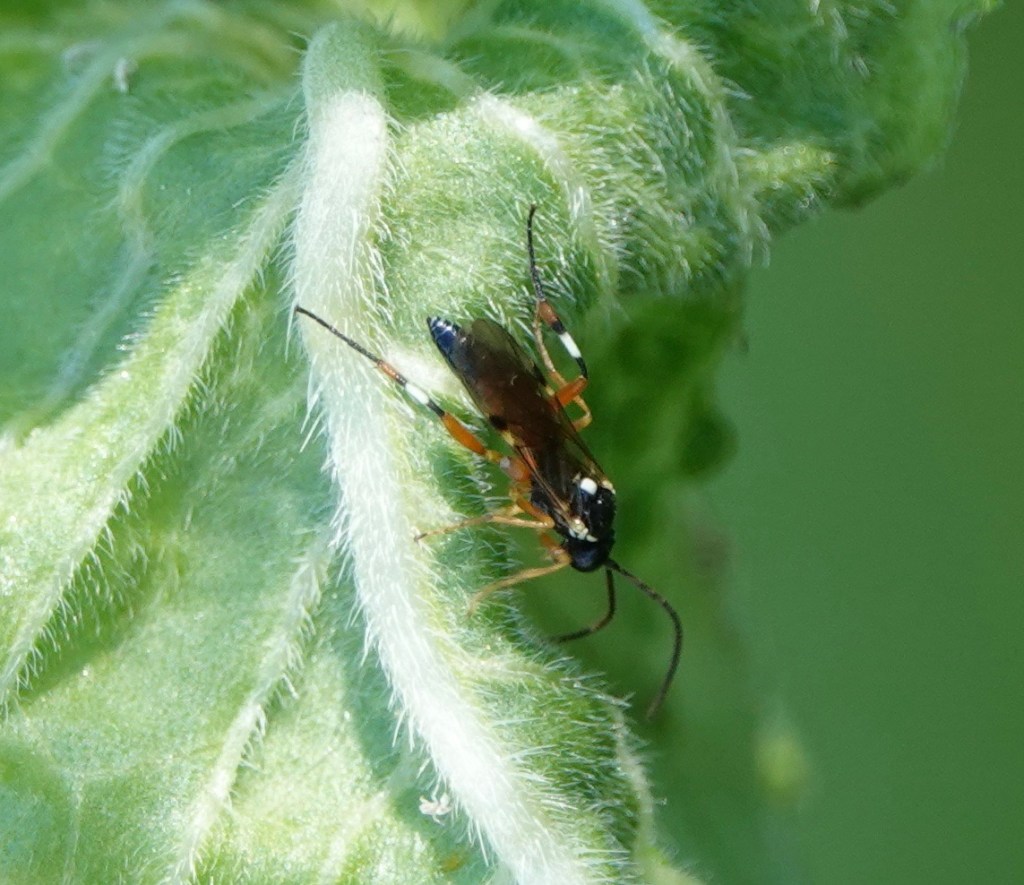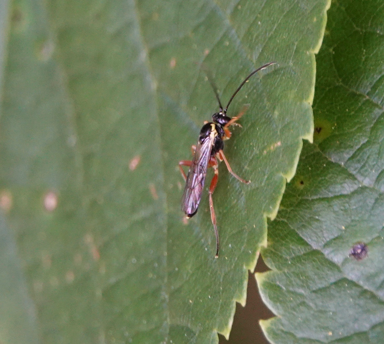 A member of the wide and wonderful world of Ichneumonidae, the ichneumon wasps, this one, as its name tells you, parasitizes hover fly larvae. Is that what it is doing here?