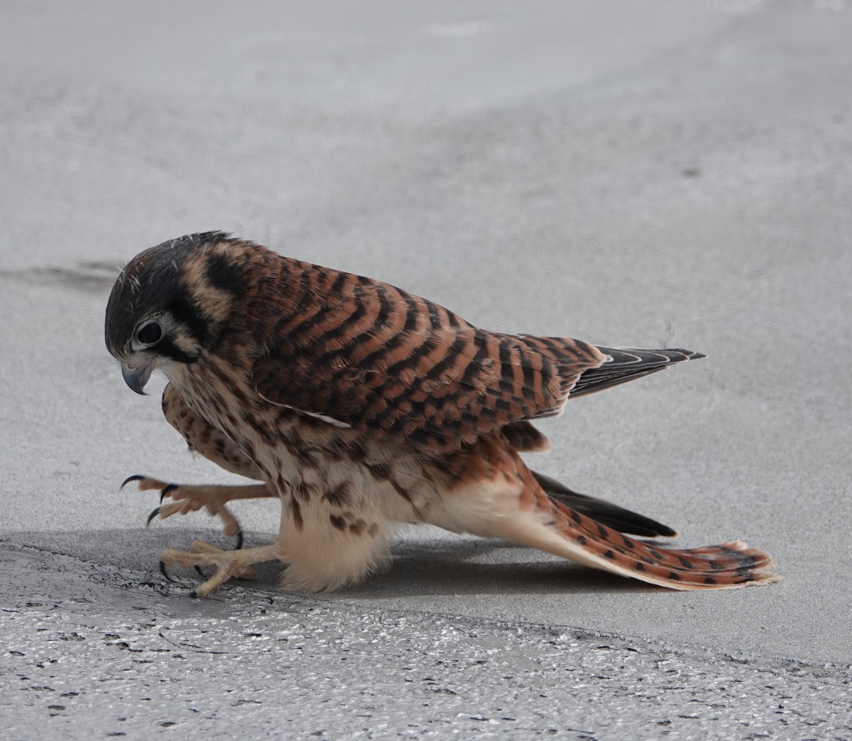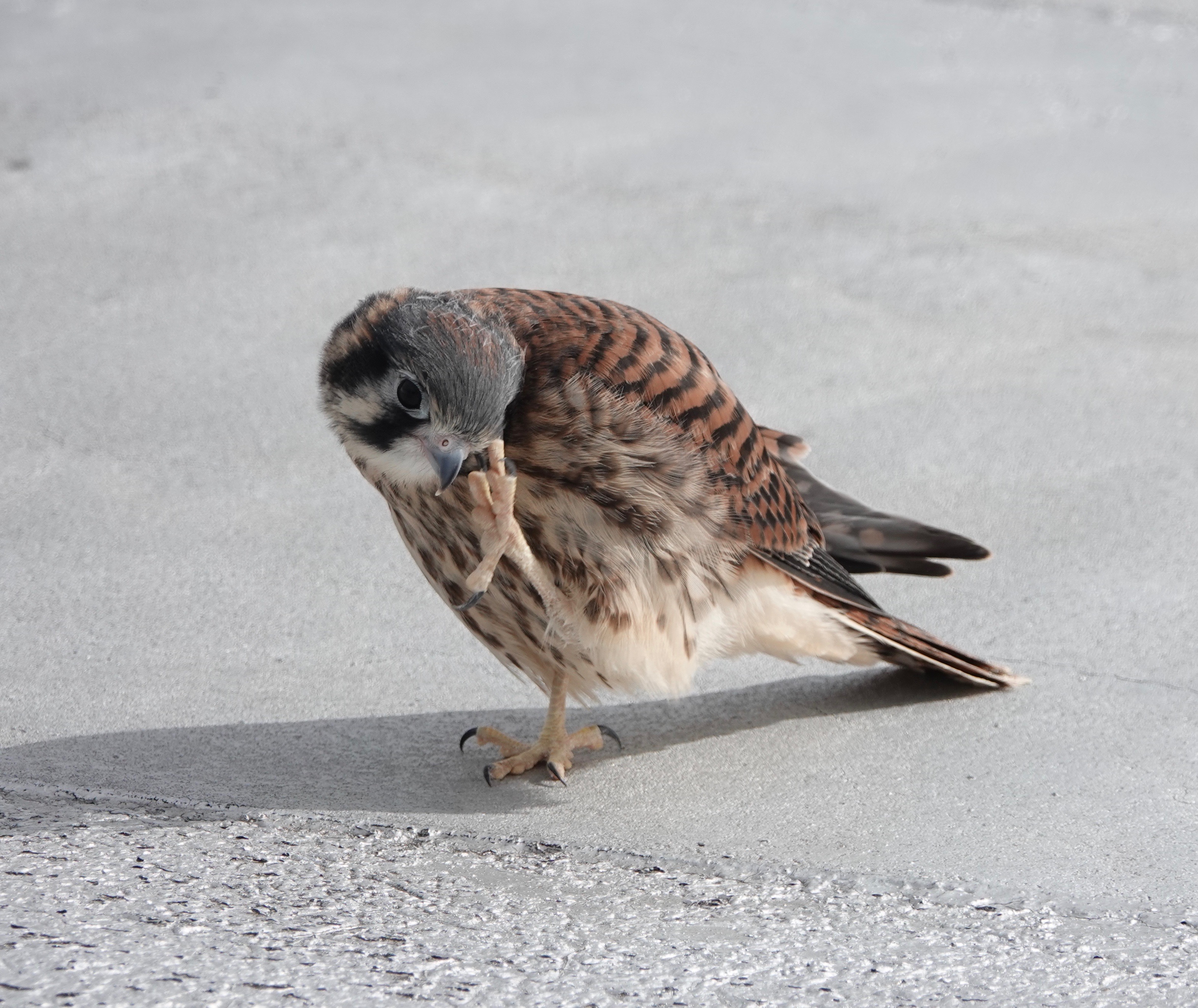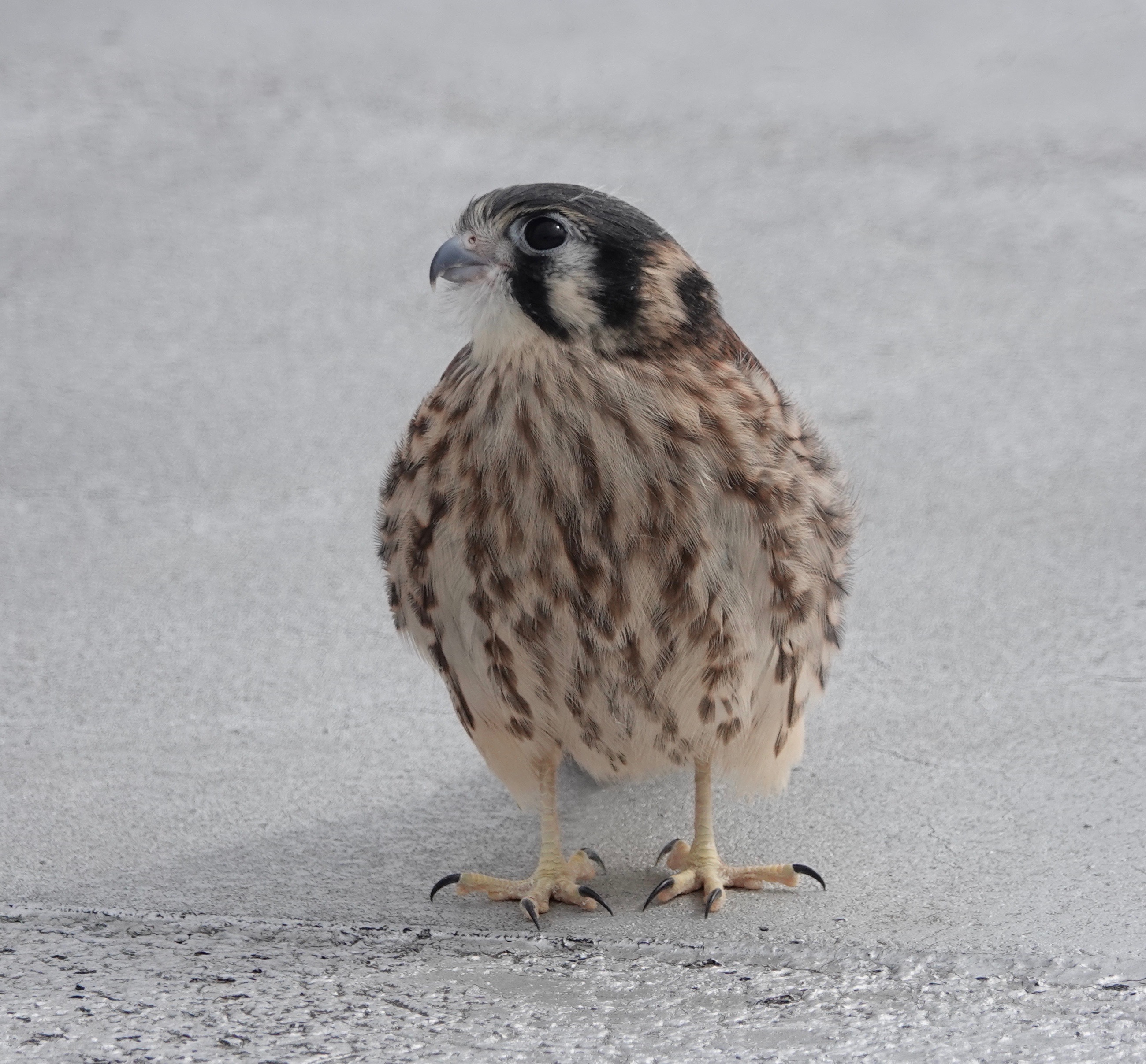 It was where it landed that was out of the ordinary. Usually, the #BrooklynKestrels pair land up near the top of the tallest London Plane tree bordering the park. This was much lower down and way out on a branch. Curious, I trained the ‘scope on the creature. No blue wings, so female. And she looked like she had a rather fuzzy head.