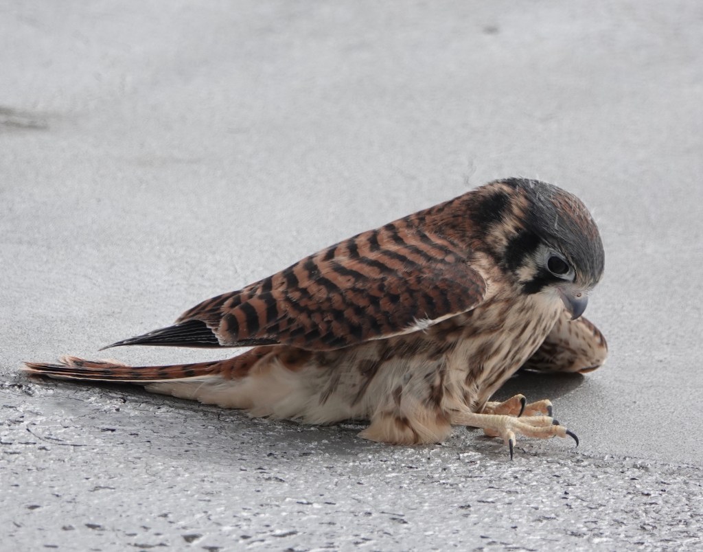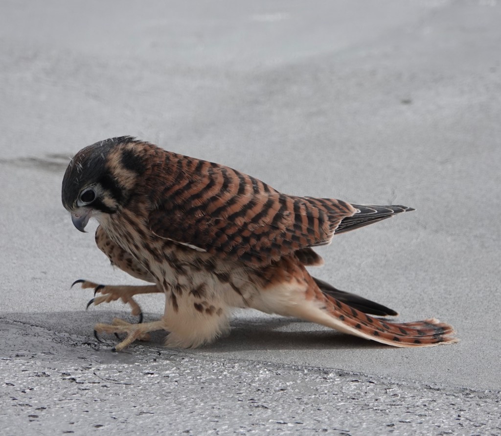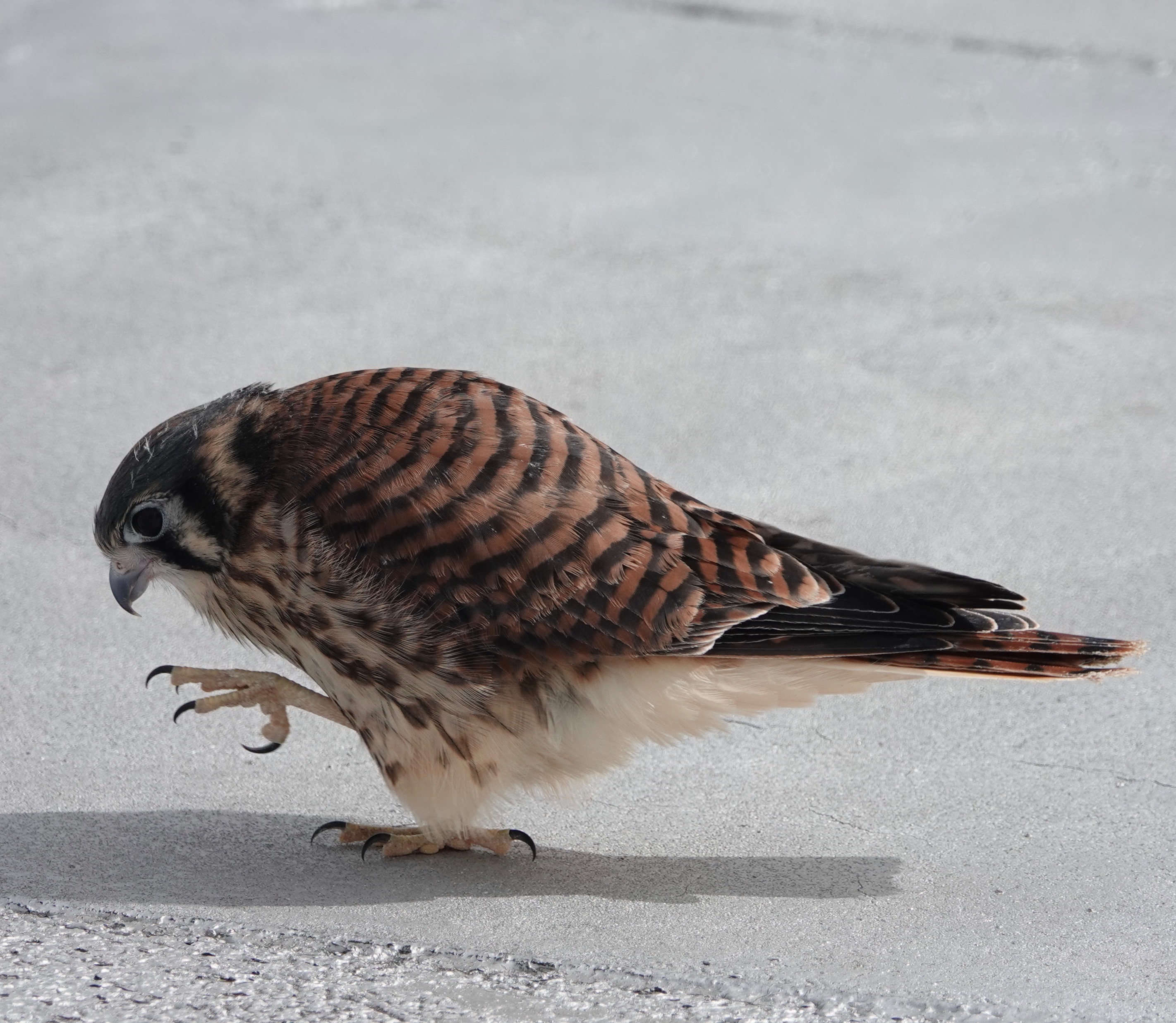 It was where it landed that was out of the ordinary. Usually, the #BrooklynKestrels pair land up near the top of the tallest London Plane tree bordering the park. This was much lower down and way out on a branch. Curious, I trained the ‘scope on the creature. No blue wings, so female. And she looked like she had a rather fuzzy head.
