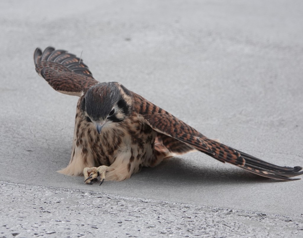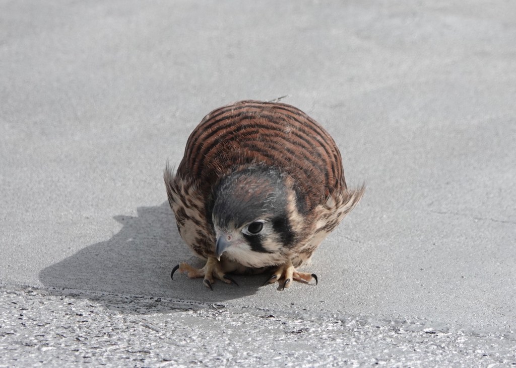 Yes, a female fledgling. Soon her mother was in the air chasing a crow. Then the male, or at least a male, was in the air, too. The female fledgling flew up towards our building and I wondered if she was on the roof…
