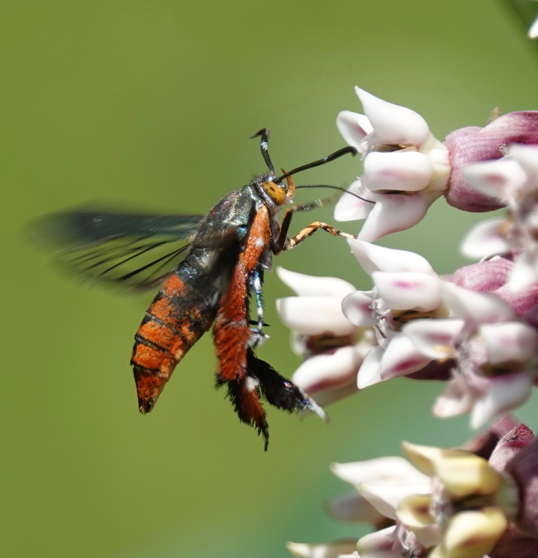 Note the clear hind wings. There are several other clearwing borers in the family Sesiidae. They’re diurnal bee/wasp mimics.