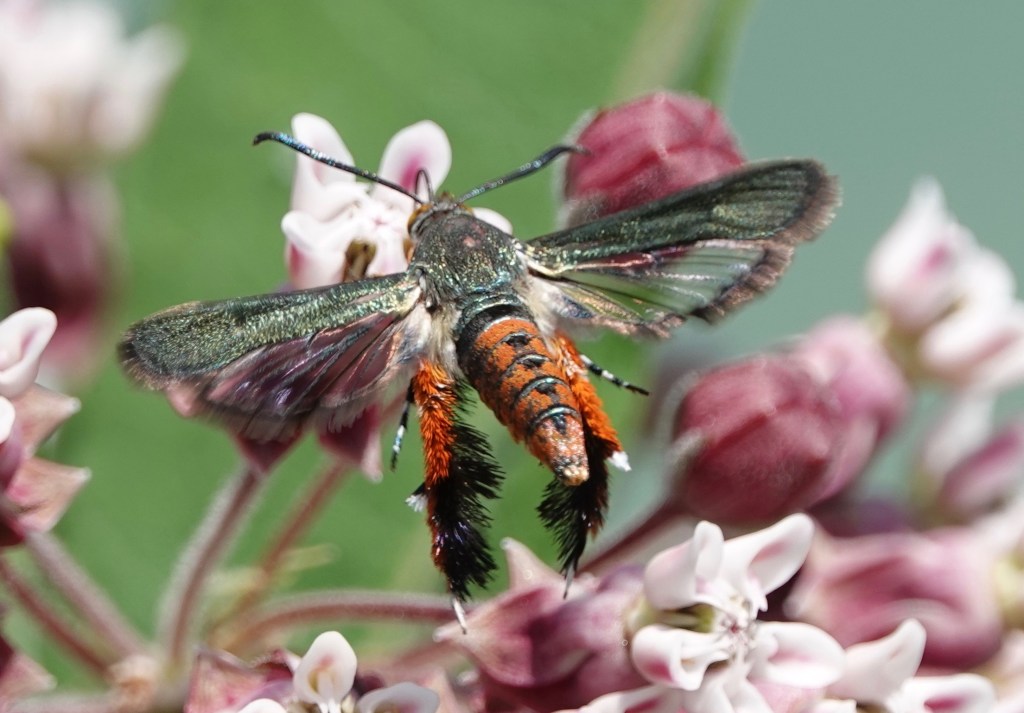 Wow! Nectaring on common milkweed, this moth is just a little bigger than a Western Honeybee.