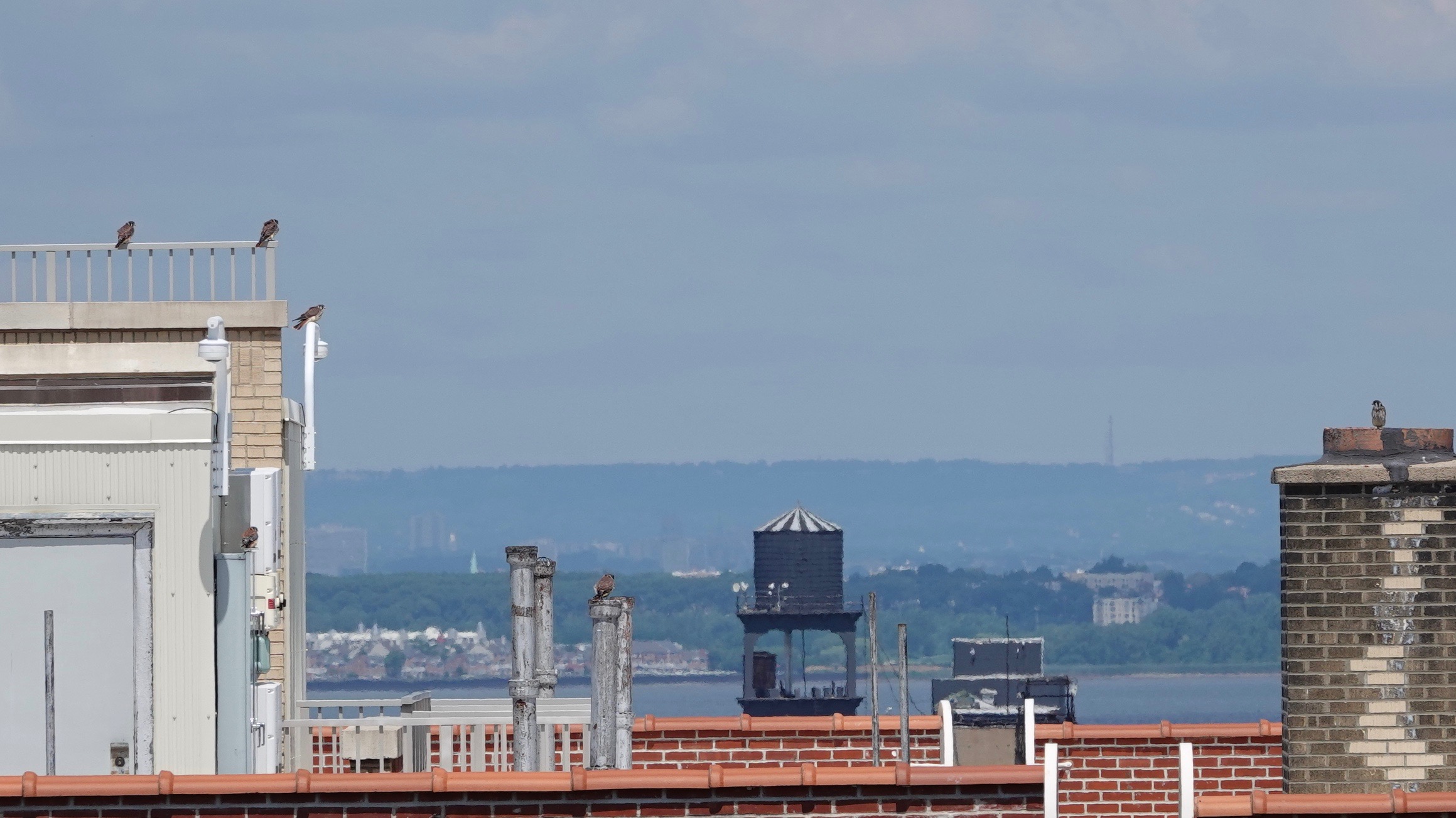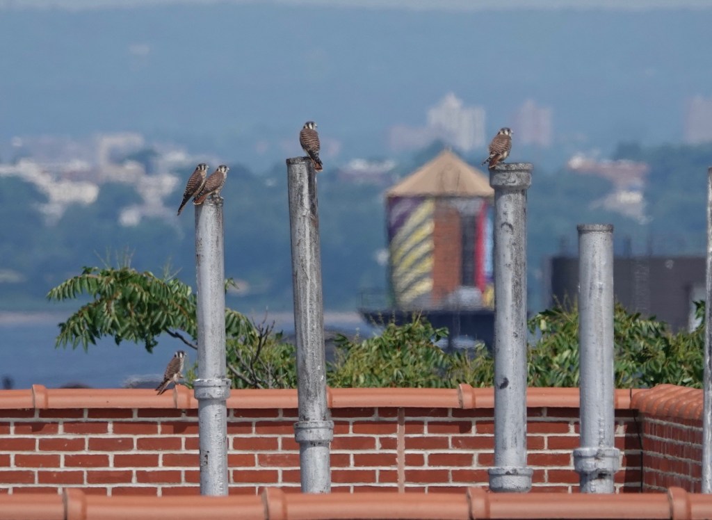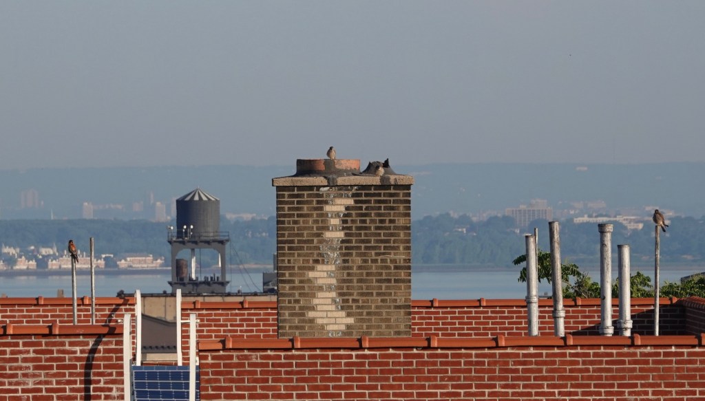 On Sunday morning, there were five American Kestrels on and off the solar building, which is about one-third of the way down the block from here. Two males, three females. In this pic, there’s a male on the left. There are two females on the chimney, and another female on the far right pipe.
