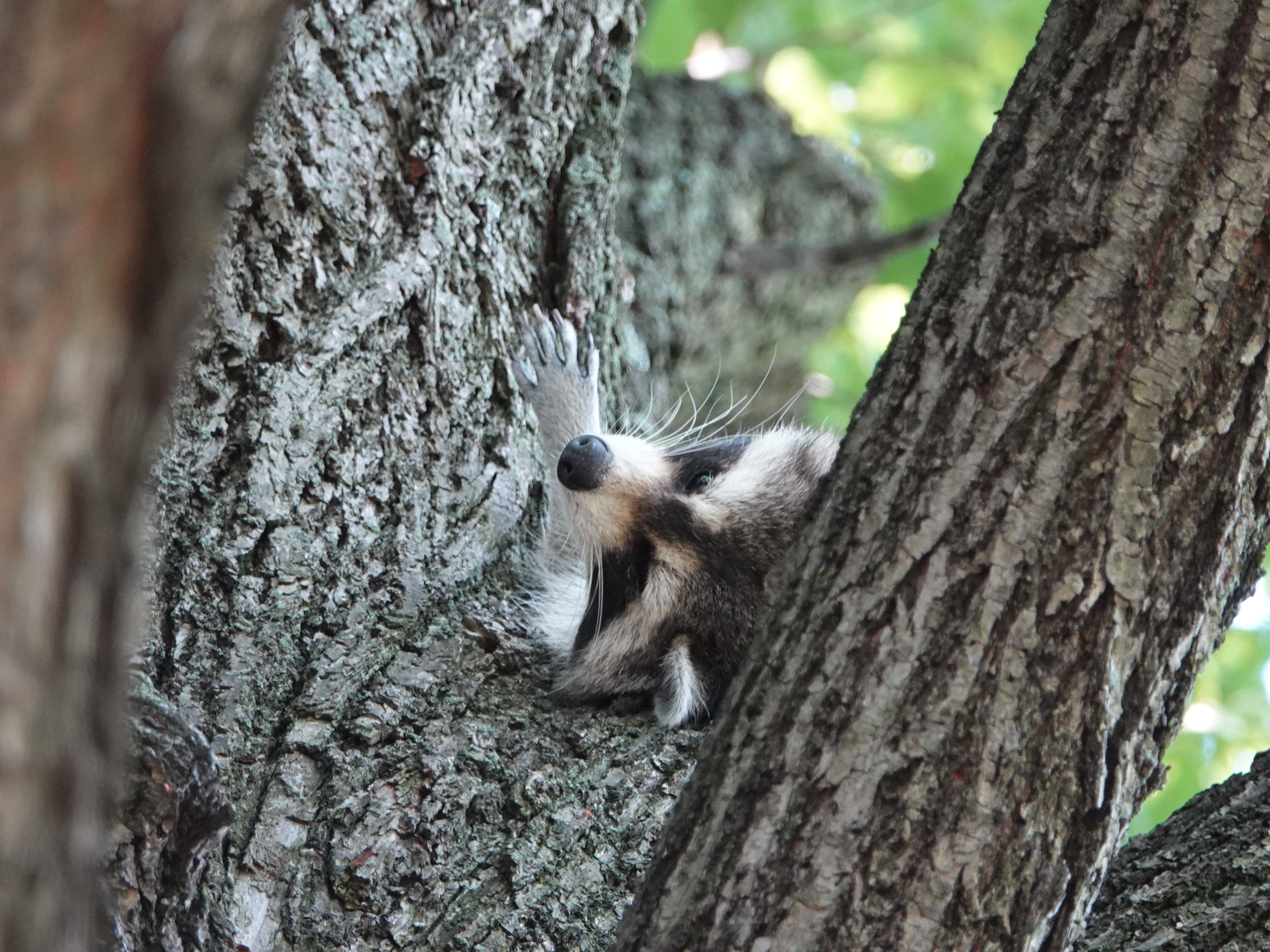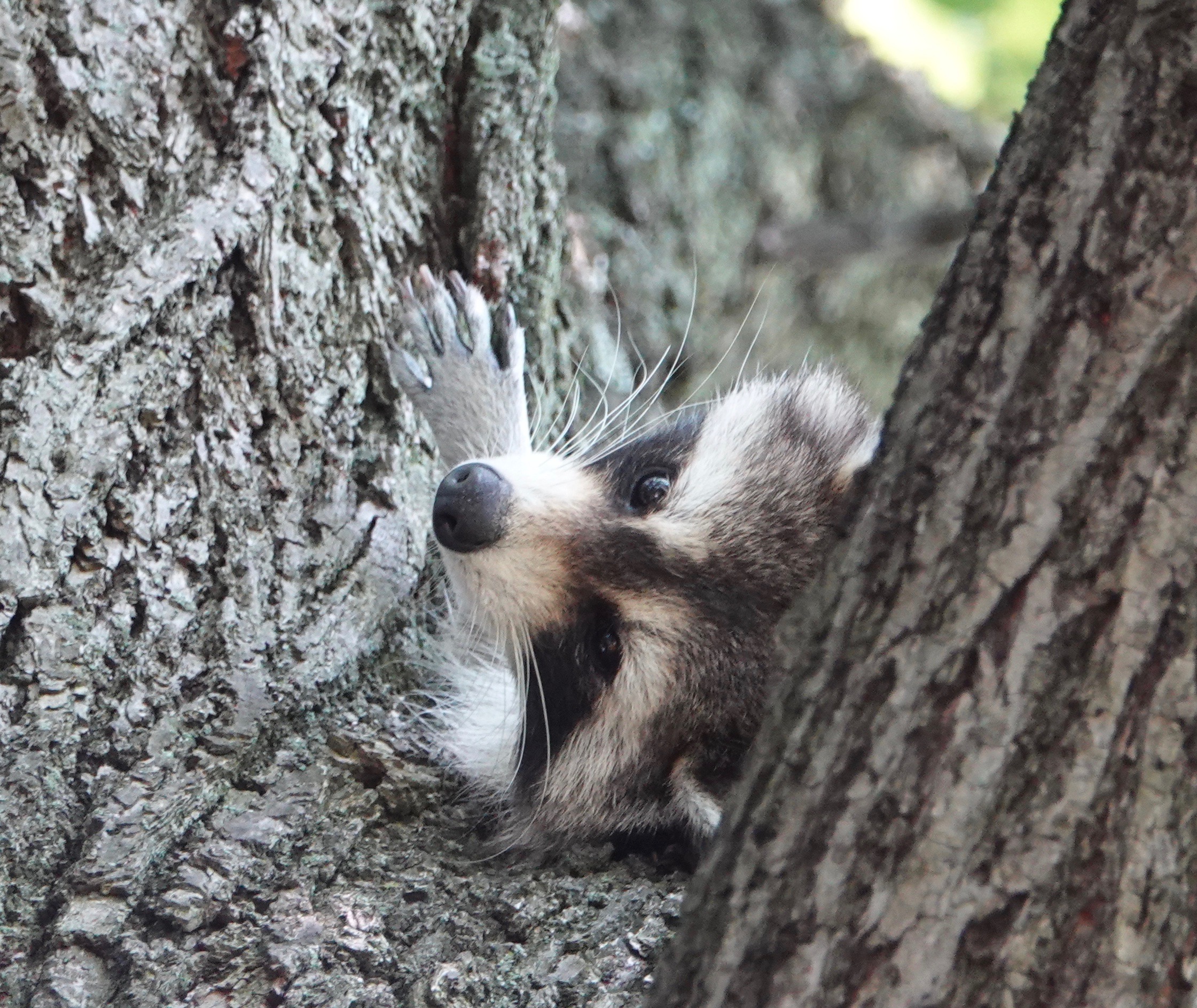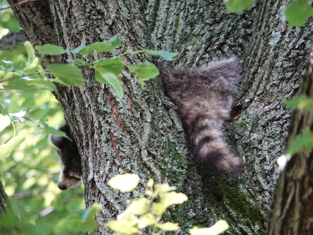 Why yes, this Common Raccoon does seem to be splayed belly-up in a tree crotch on a hot, humid day.