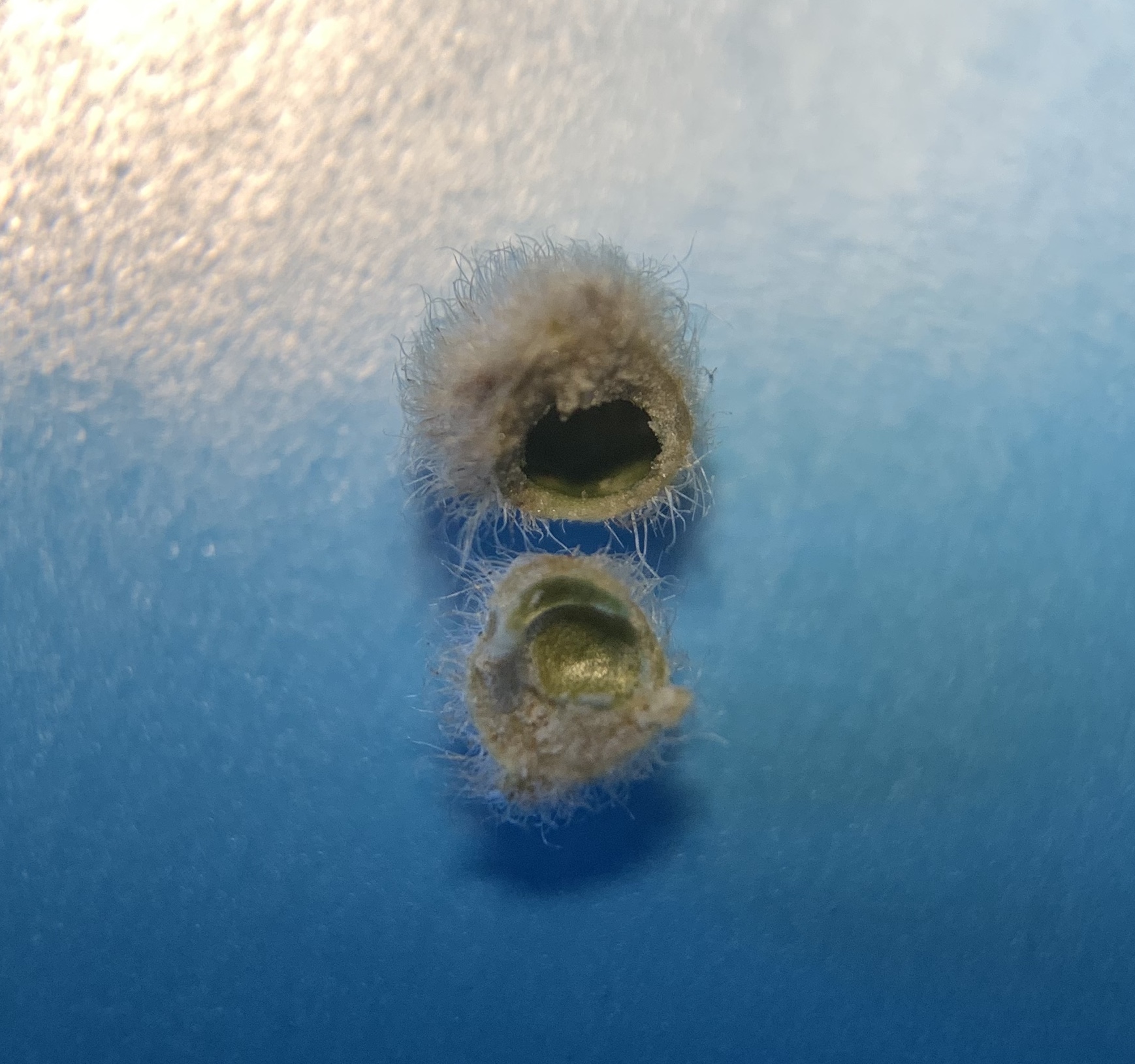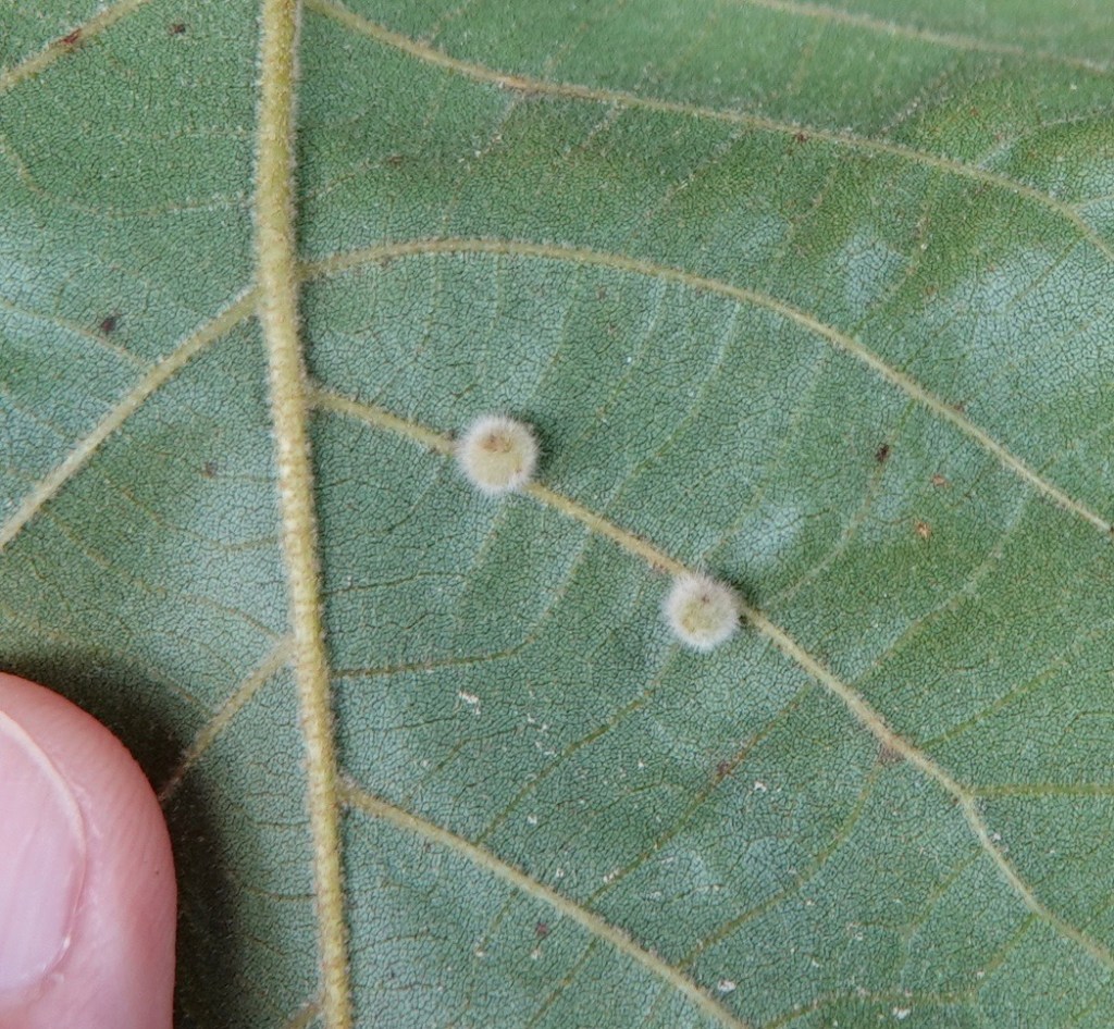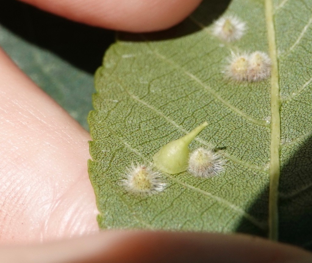 In the above pictures, the funnel-like ones are Hickory Smooth Gumdrop Gall Midges. The furry ones… well, there are several furry ones and I’ll need to cut these open to discover what they are.