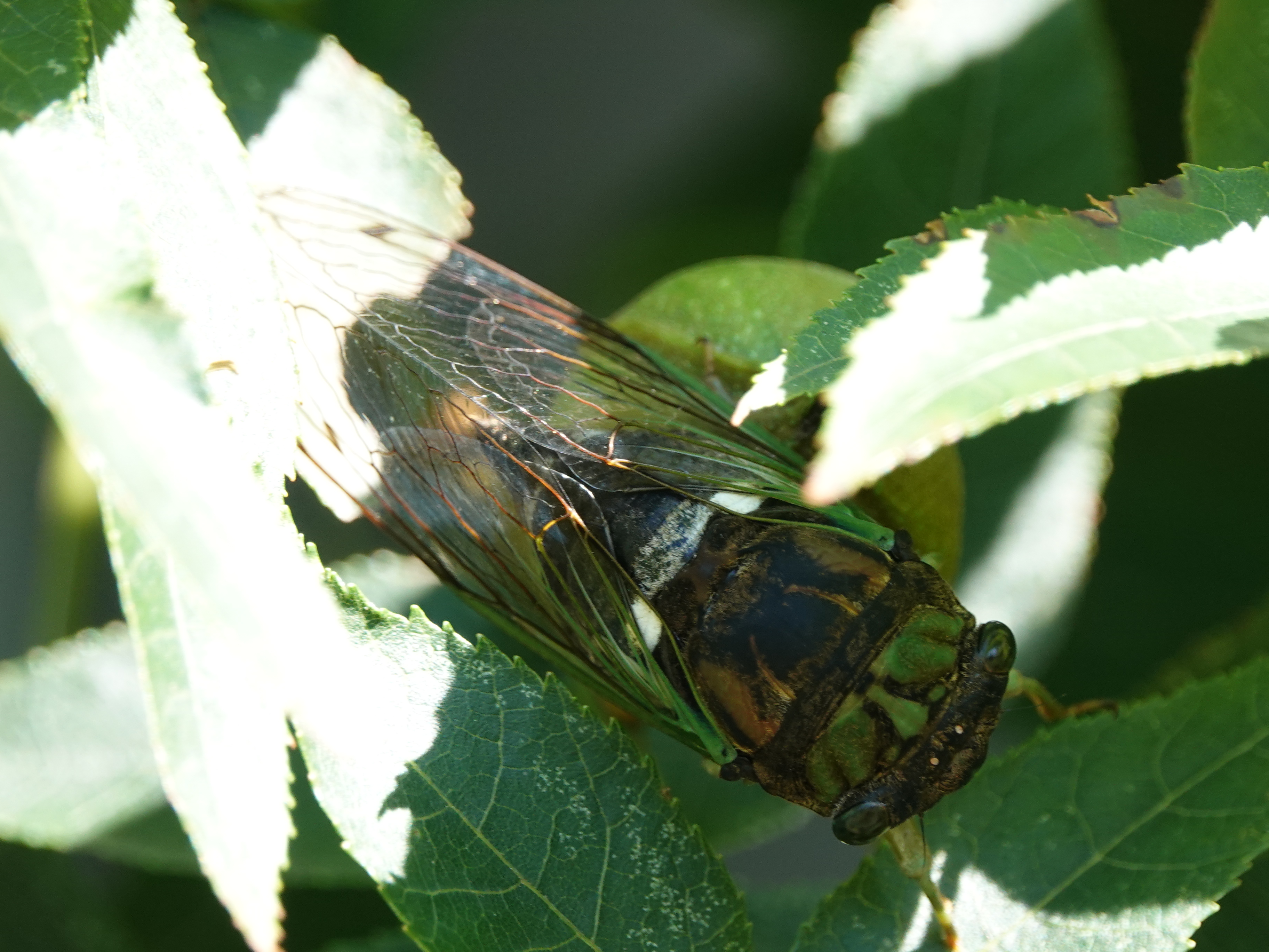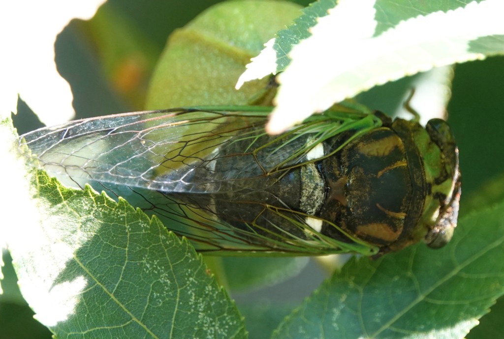 Swamp Cicada (Neotibicen tibicen) orbits a butternut hickory nut.