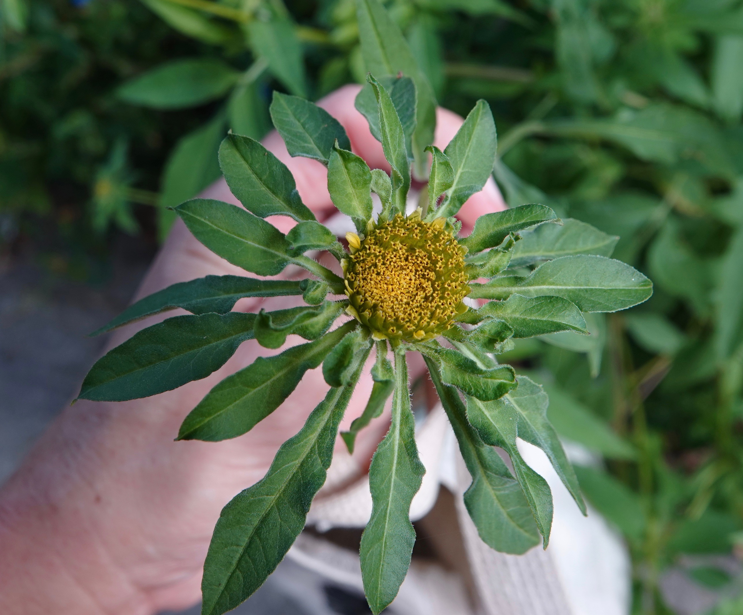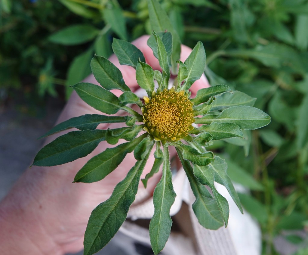 The plant pictured above is one of the bur marigolds, genus Bidens. Maybe tall beggartick, B. vulgata.