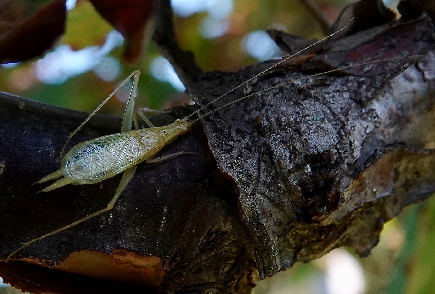 Oecanthus genus common tree cricket; species can only be told apart by examining their antennae bases.