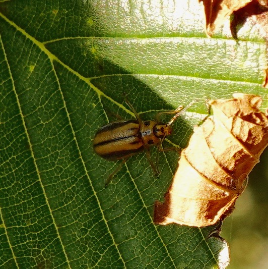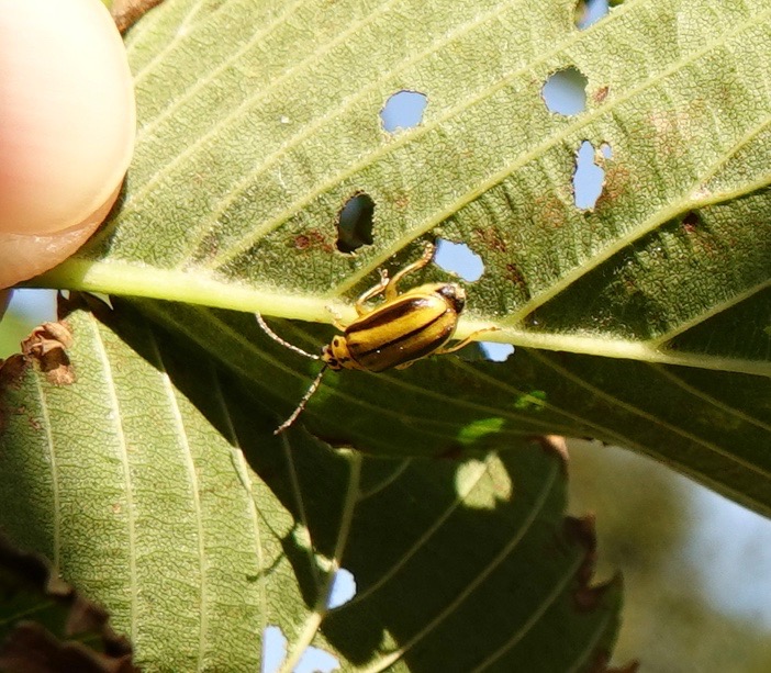 Someone has been chewing on this elm sapling… Elm Leaf Beetle (Xanthogaleruca luteola).