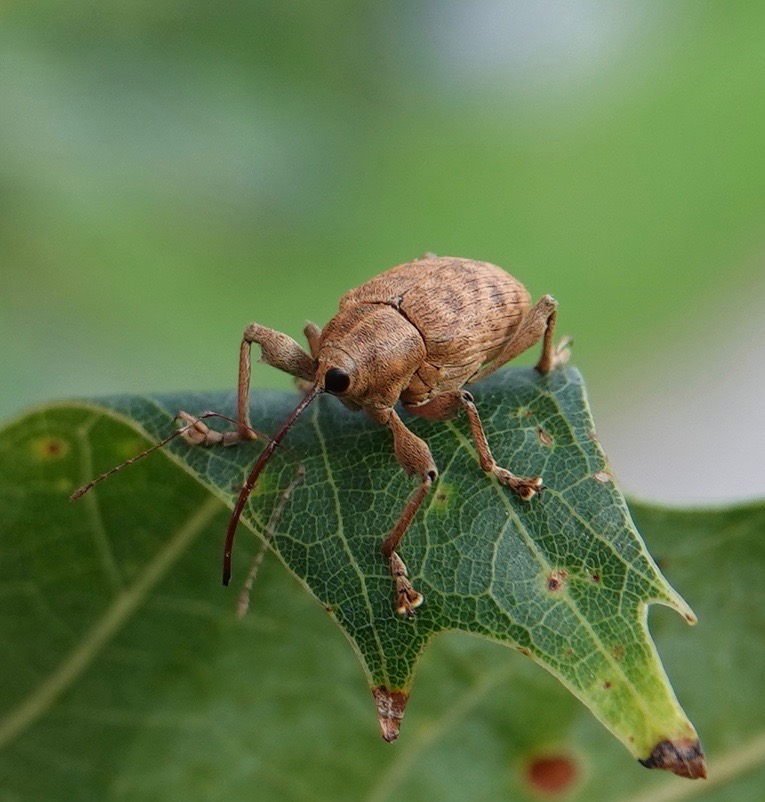 Curculio genus weevil, with a snout long enough to reach into nuts and acorns. Found on an old northern red oak ripe with big acorns.