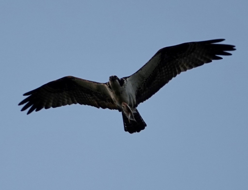 An Osprey passes overhead, carrying a fish head-forward. Location: Green-Wood, approximately a mile from the bay. (I don’t think that’s a Sylvan Water fresh-water fish.)