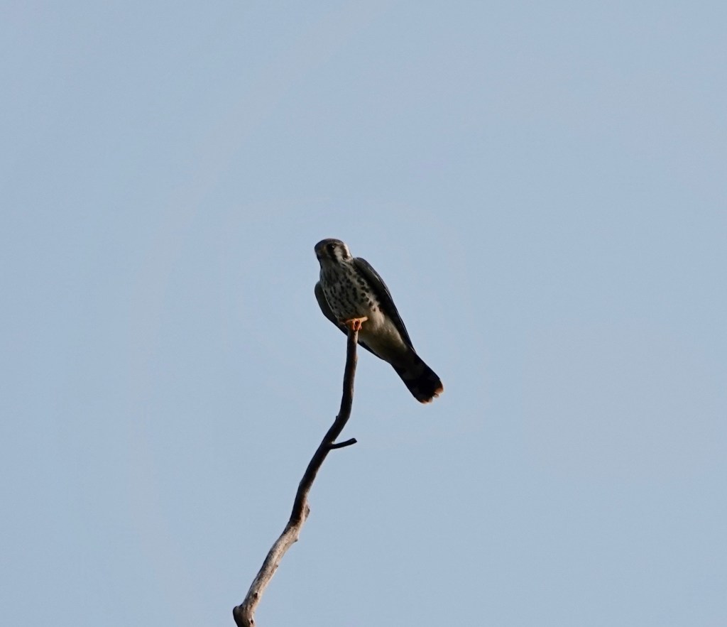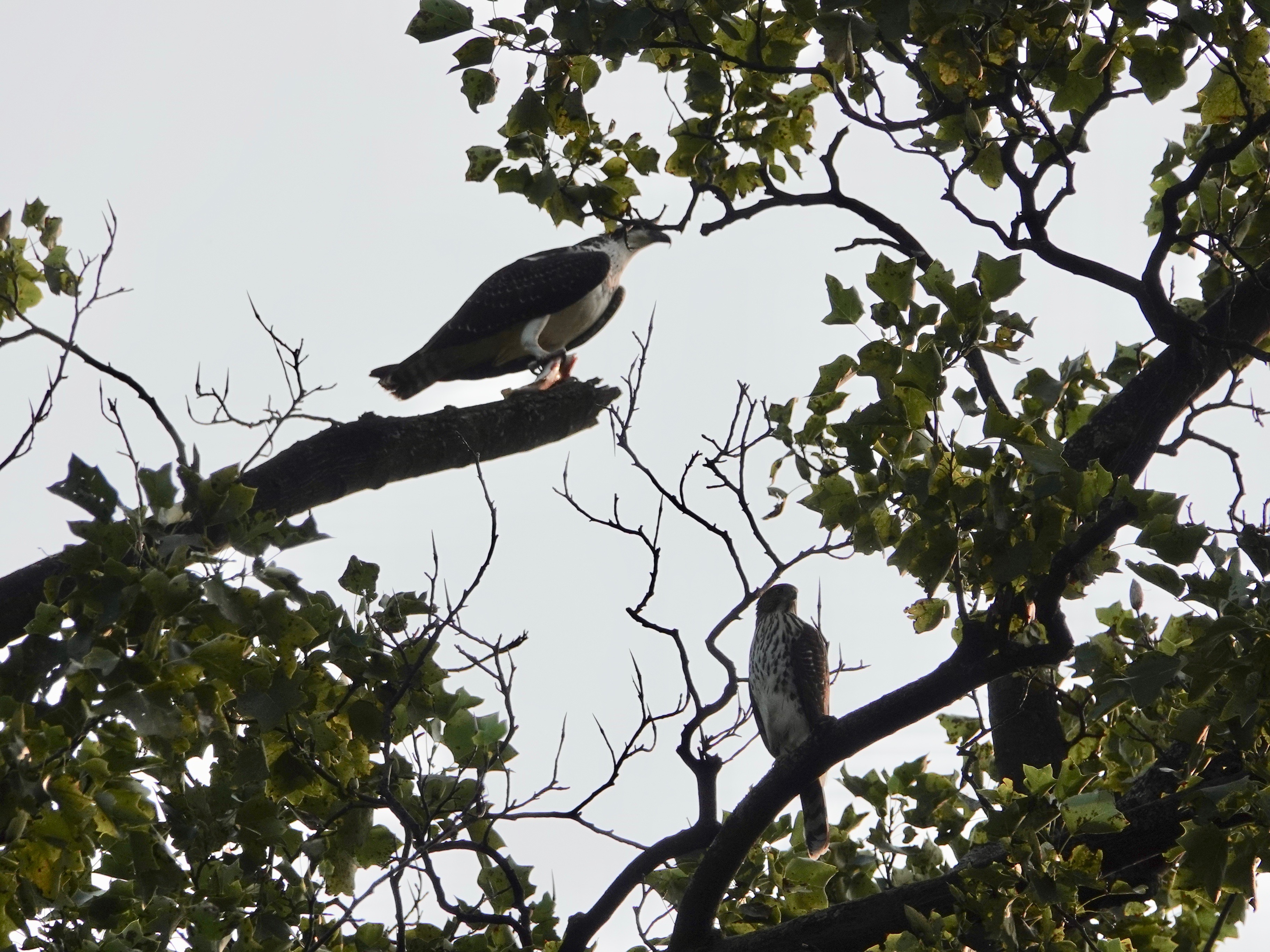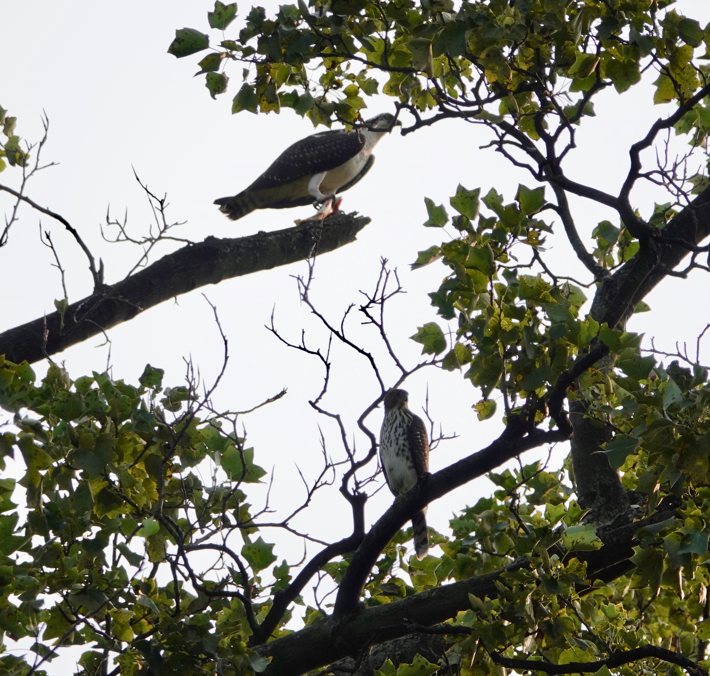 I saw that this very same tuliptree had an American Kestrel at its tippy-top! Three raptors in a tree at the same time is a record for me. The situation didn’t last long. The falcon made a couple passes over the Osprey and flew off. The Cooper’s flew up towards it, stirring the Osprey into flight, fish still firmly in grip. (By now, it was half a fish.)