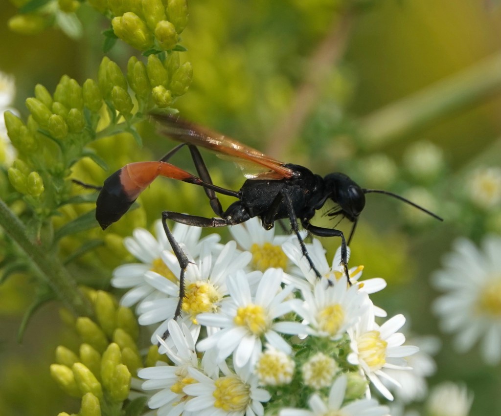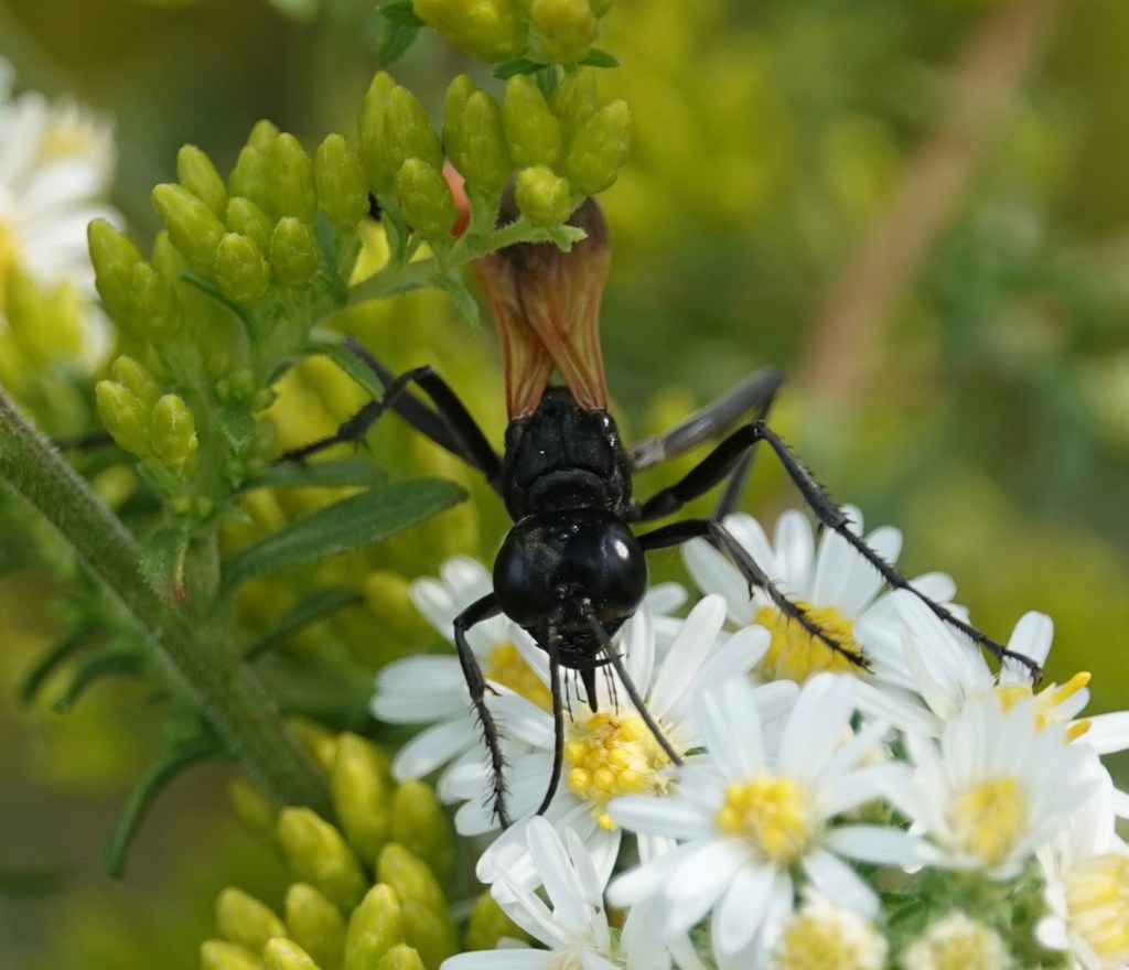 This is Ammophila pictipennis, I think, one of the thread-waisted wasps.