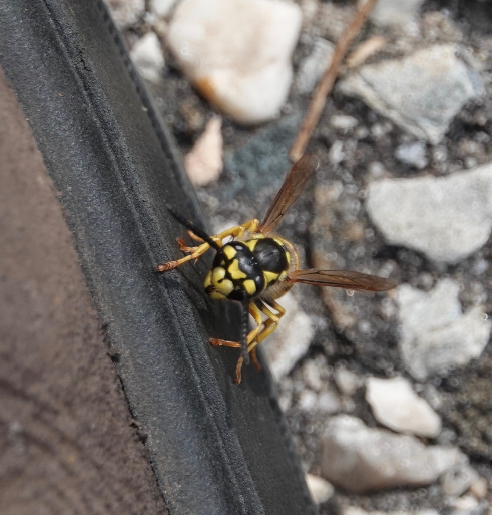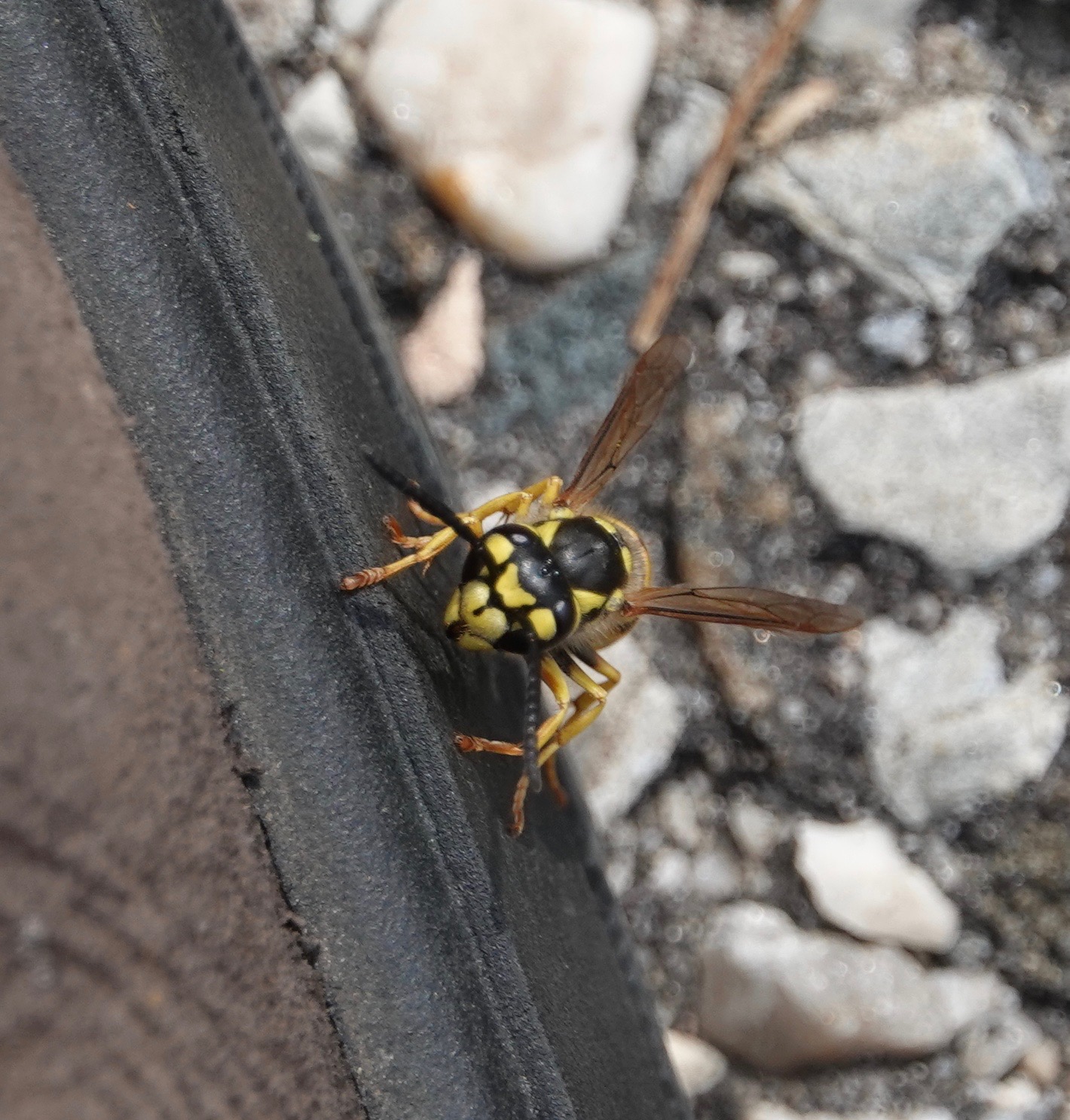 This German Yellowjacket was obsessed with my boots, flying around them, landing besides them, and at one point climbing up one of them. I moved a few feet away, and the process repeated itself. Did it again, and it happened again. Finally lost the wasp by moving further away.