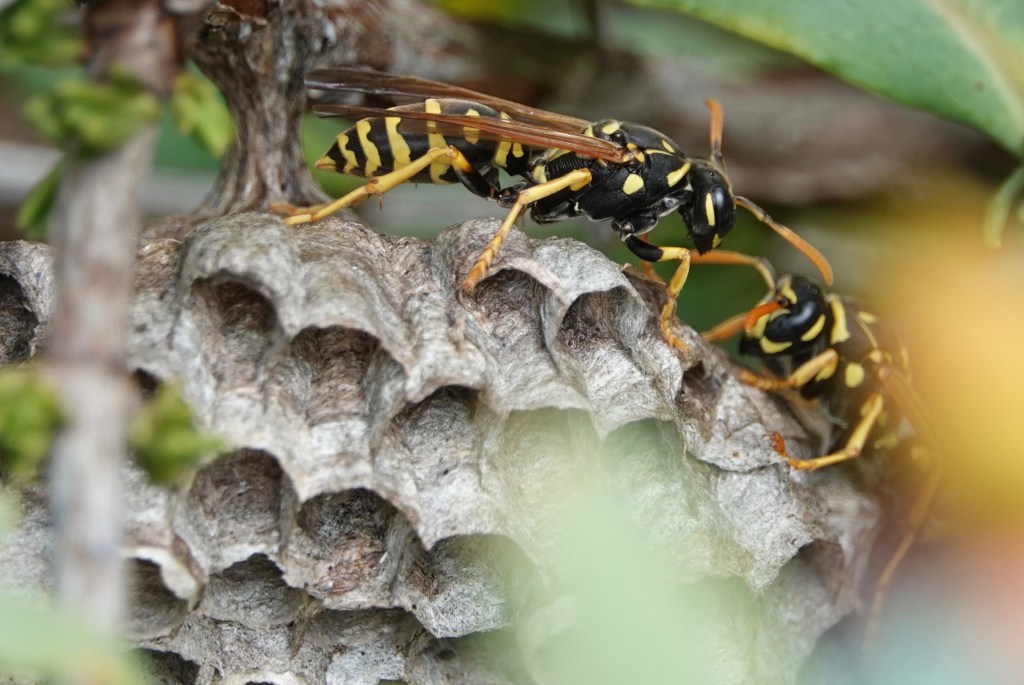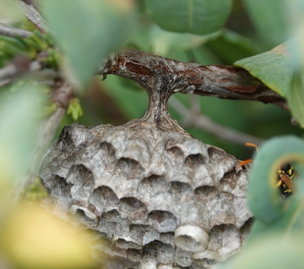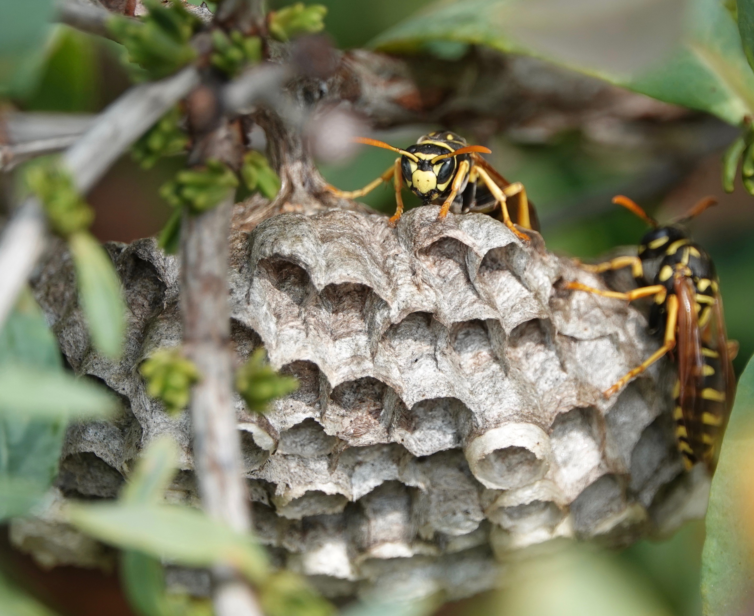 It was a cool morning, and I didn’t see any of these ubiquitous European Paper Wasps out and about until I happened to spy one of their nests in the plantings.
