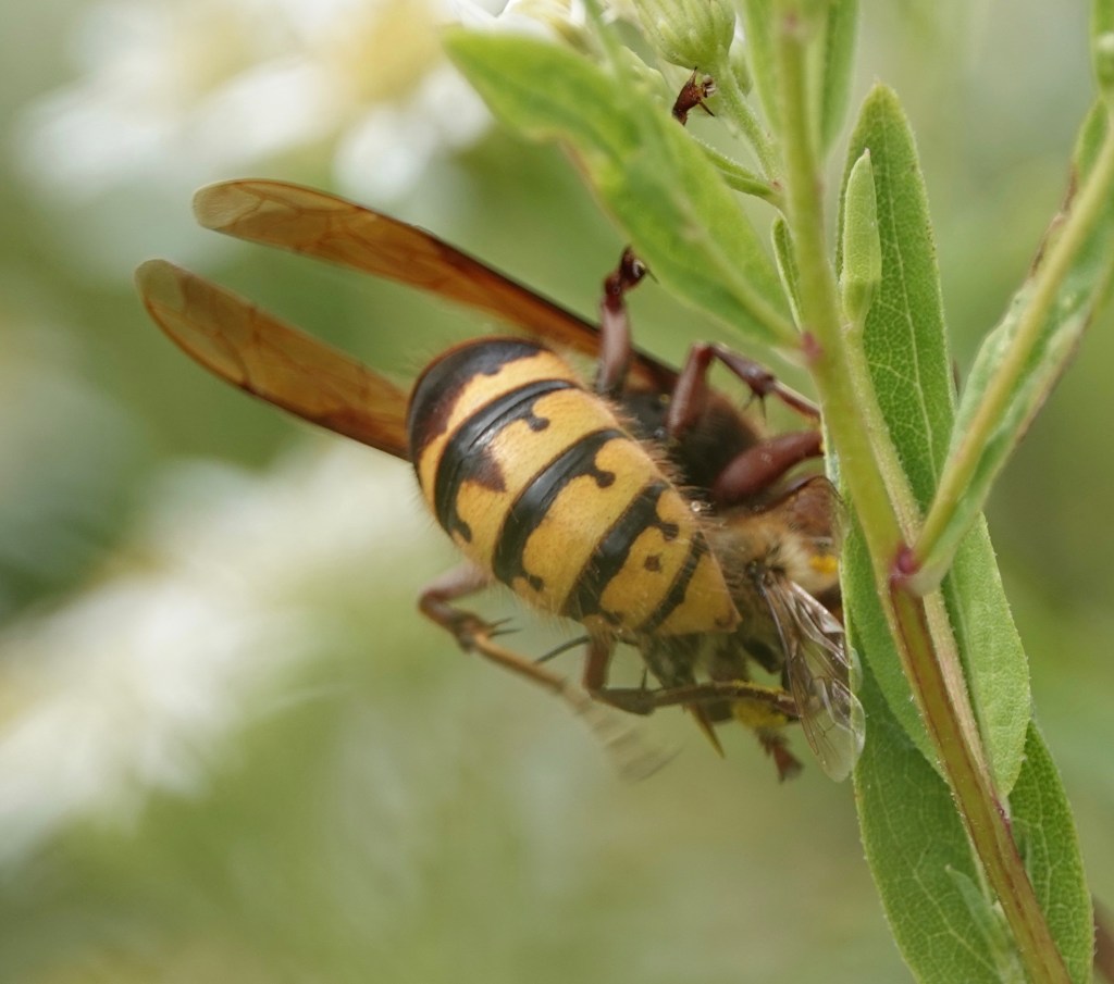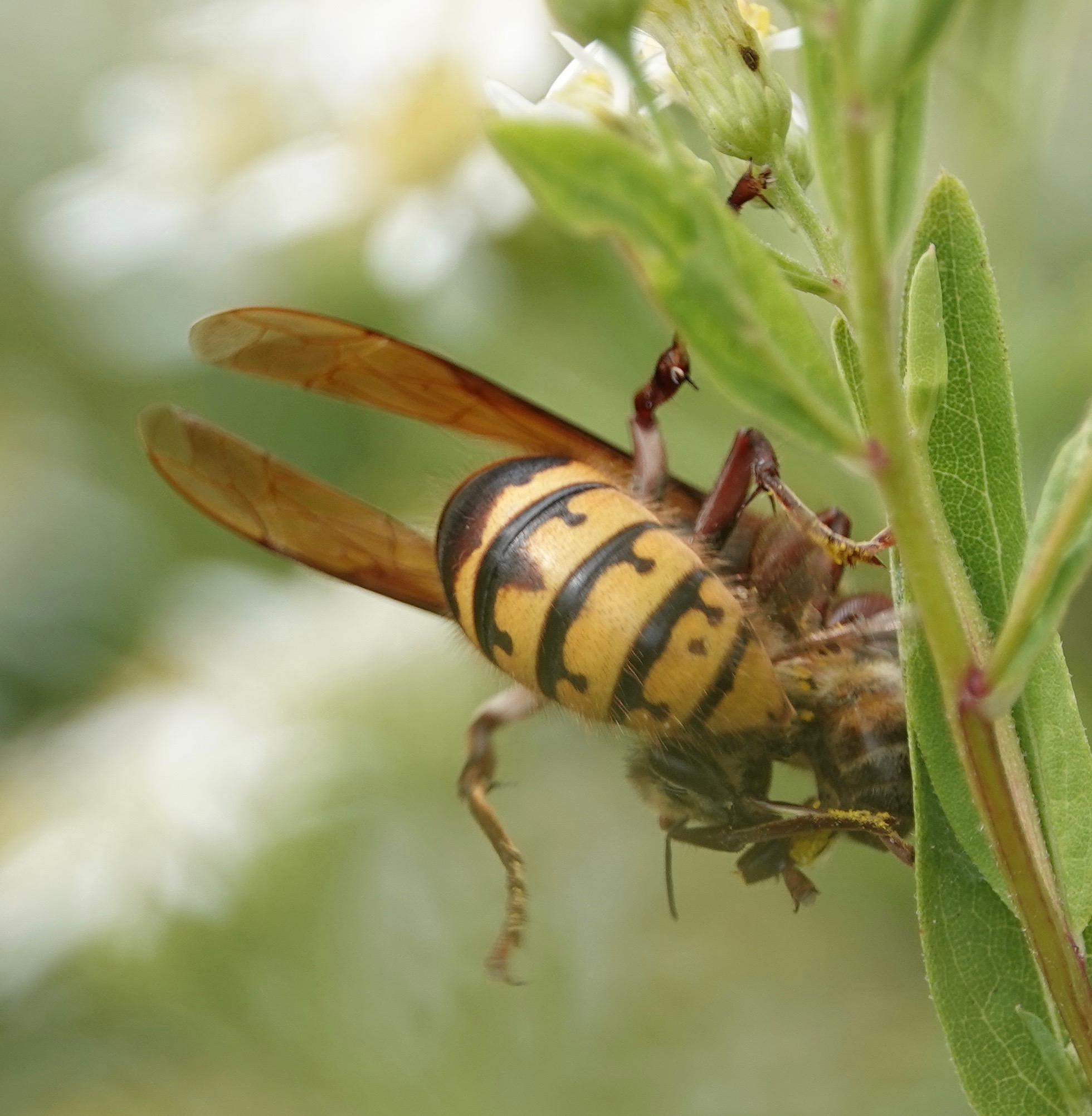 Here’s a European Hornet, hanging from at least one foot, devouring a Western Honey Bee. These big hornets are relatively slow fliers and seem to miss most of their tackle-like approaches to prey, but they clearly hit enough to carry on.