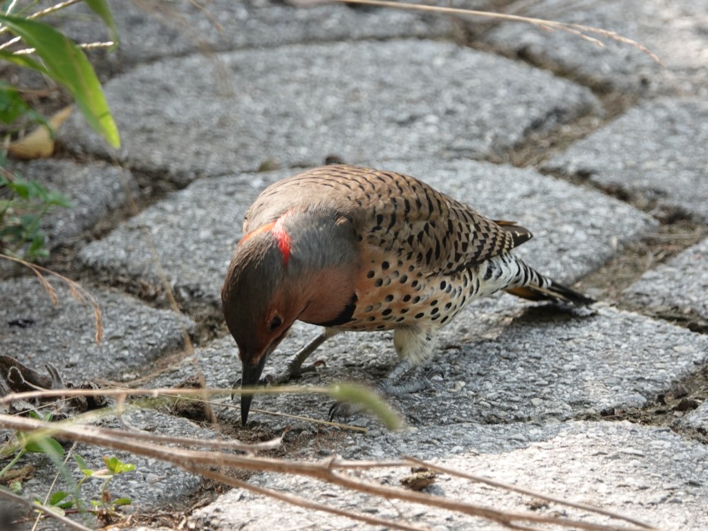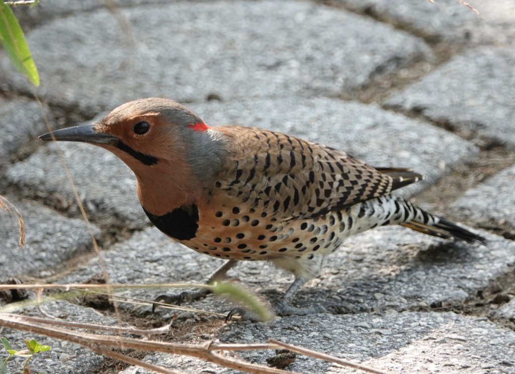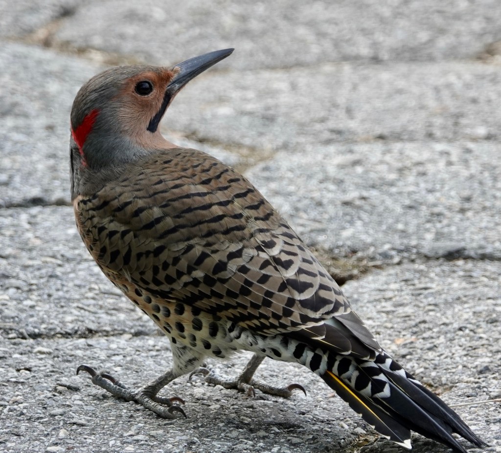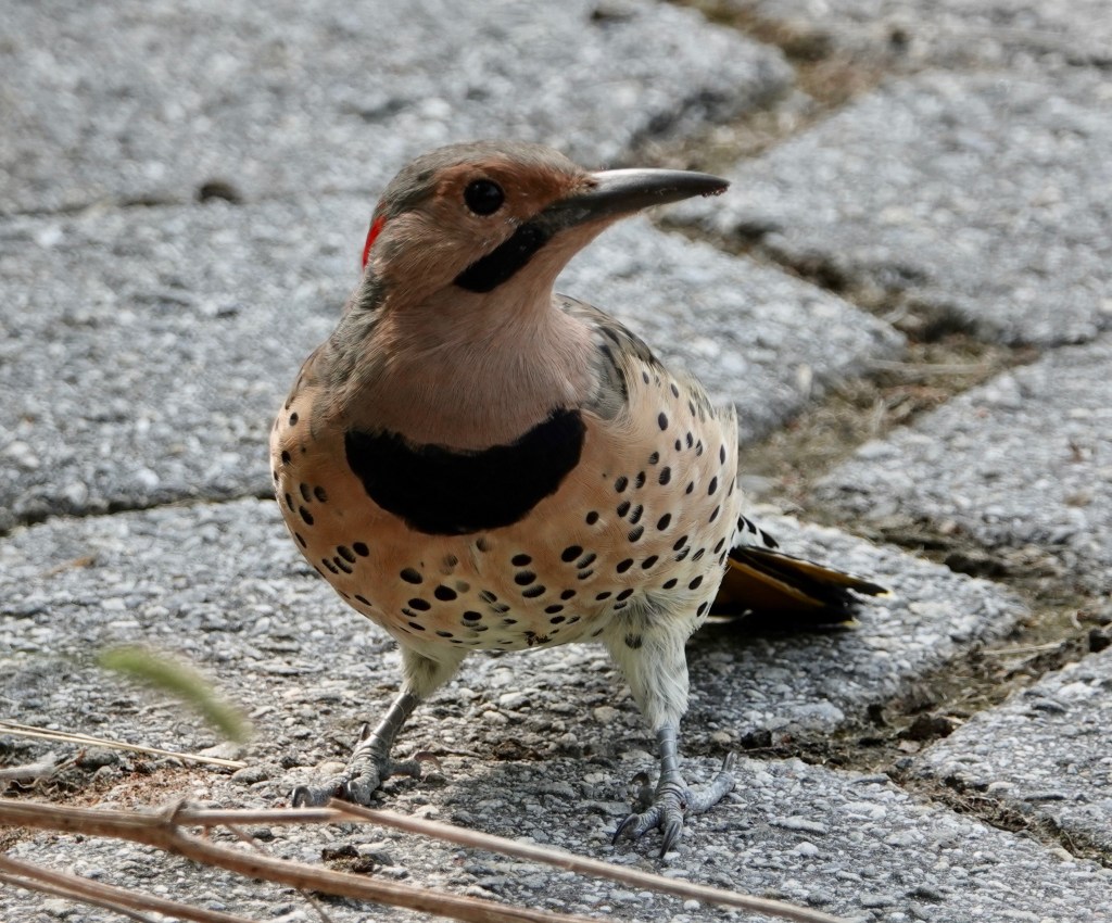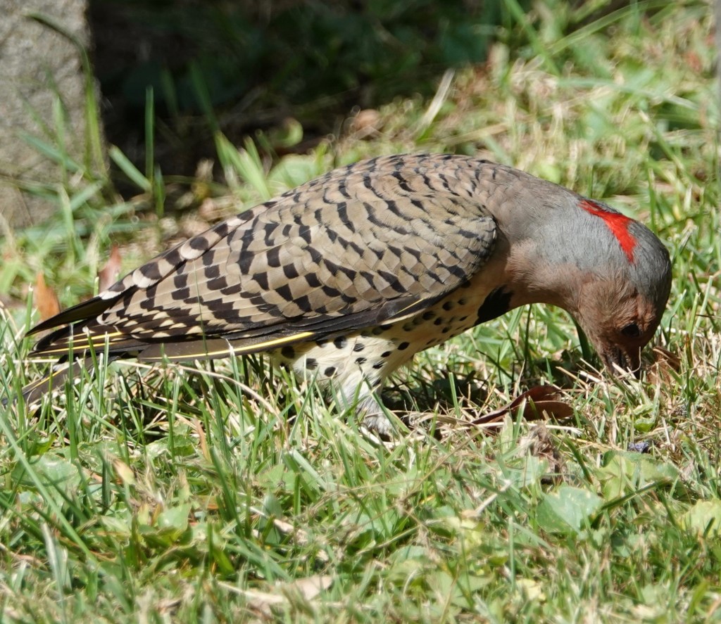 Here’s one of the yellow shafts of their utterly distinctive tail feathers. (Western Northern Flickers have red shafts.)