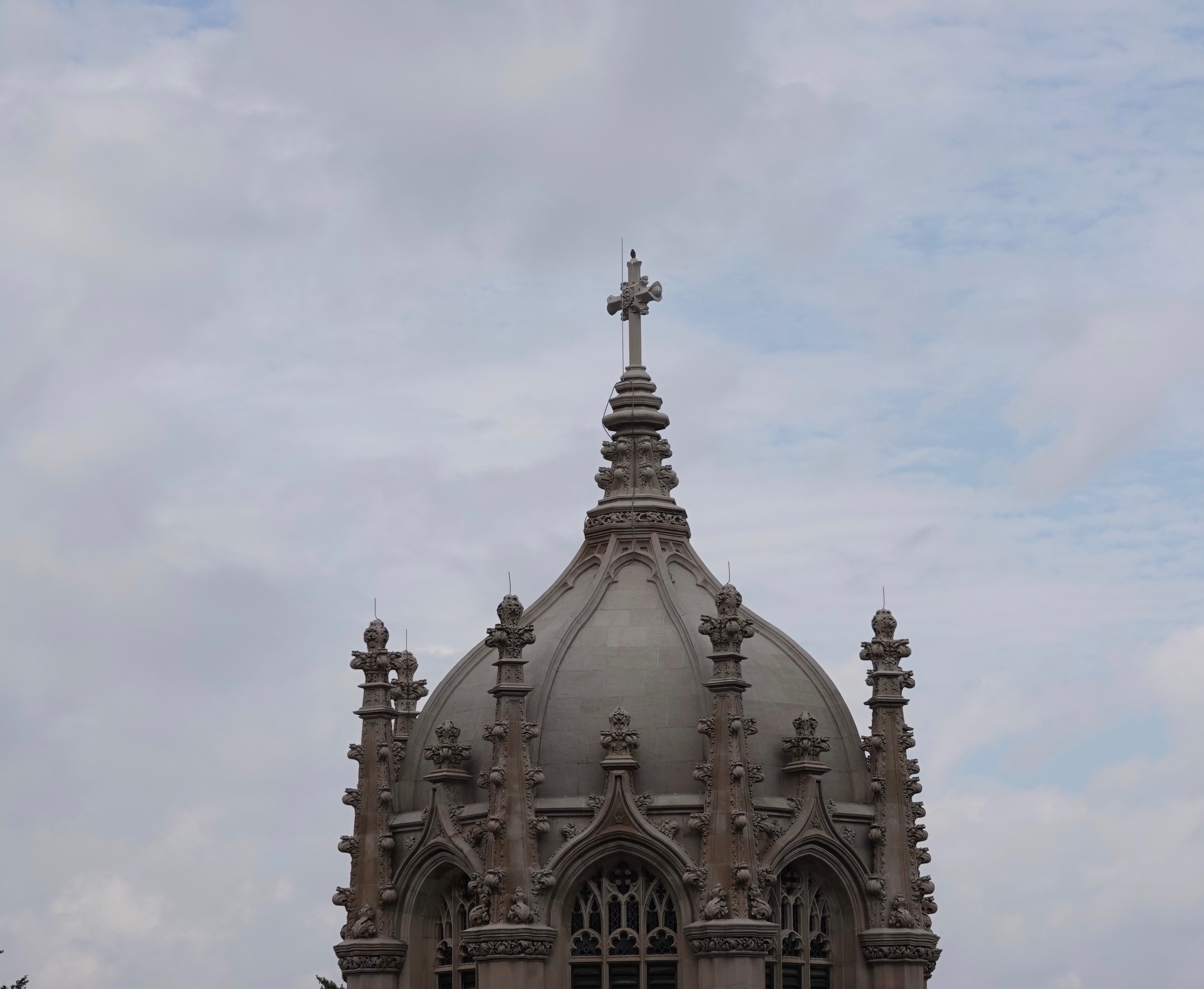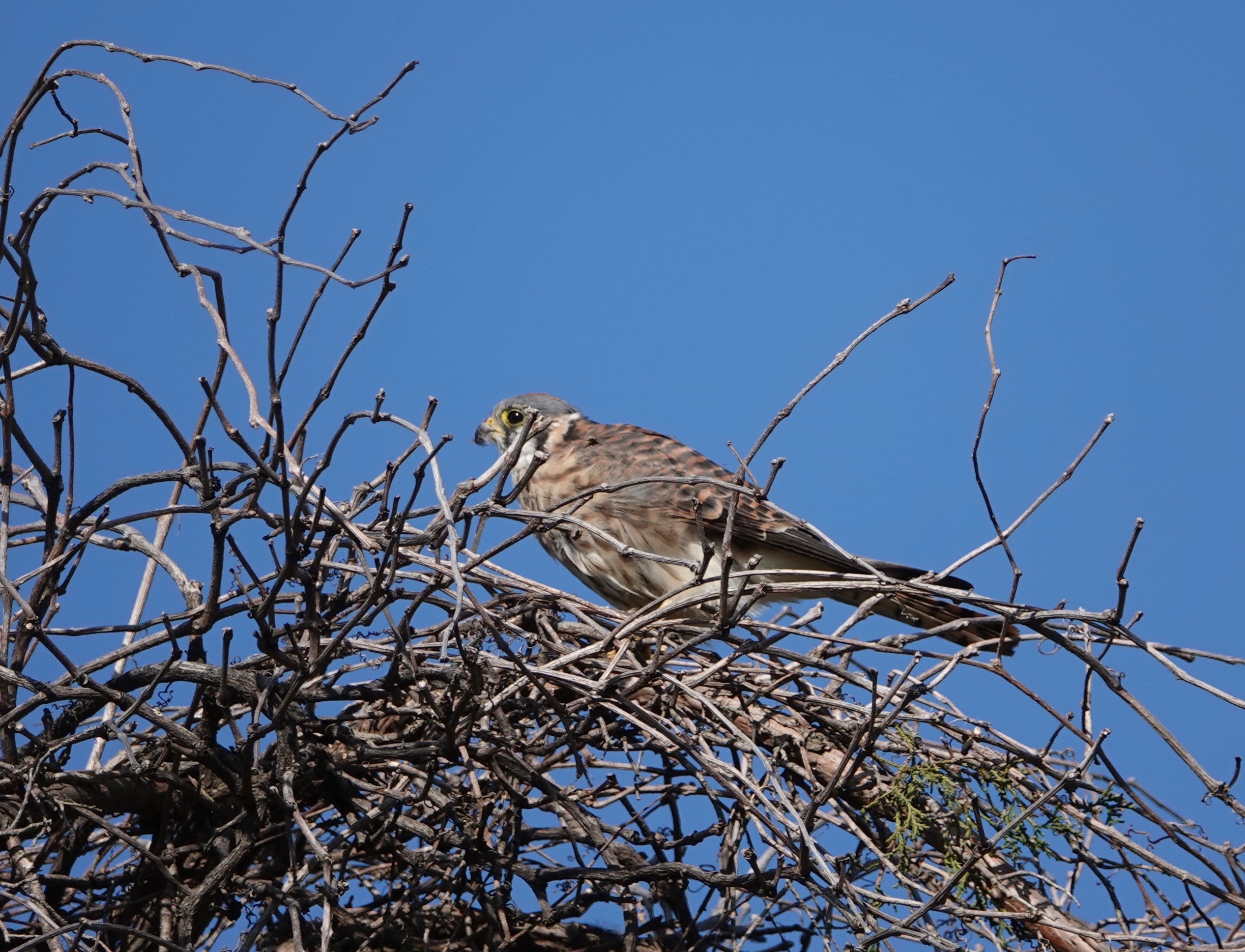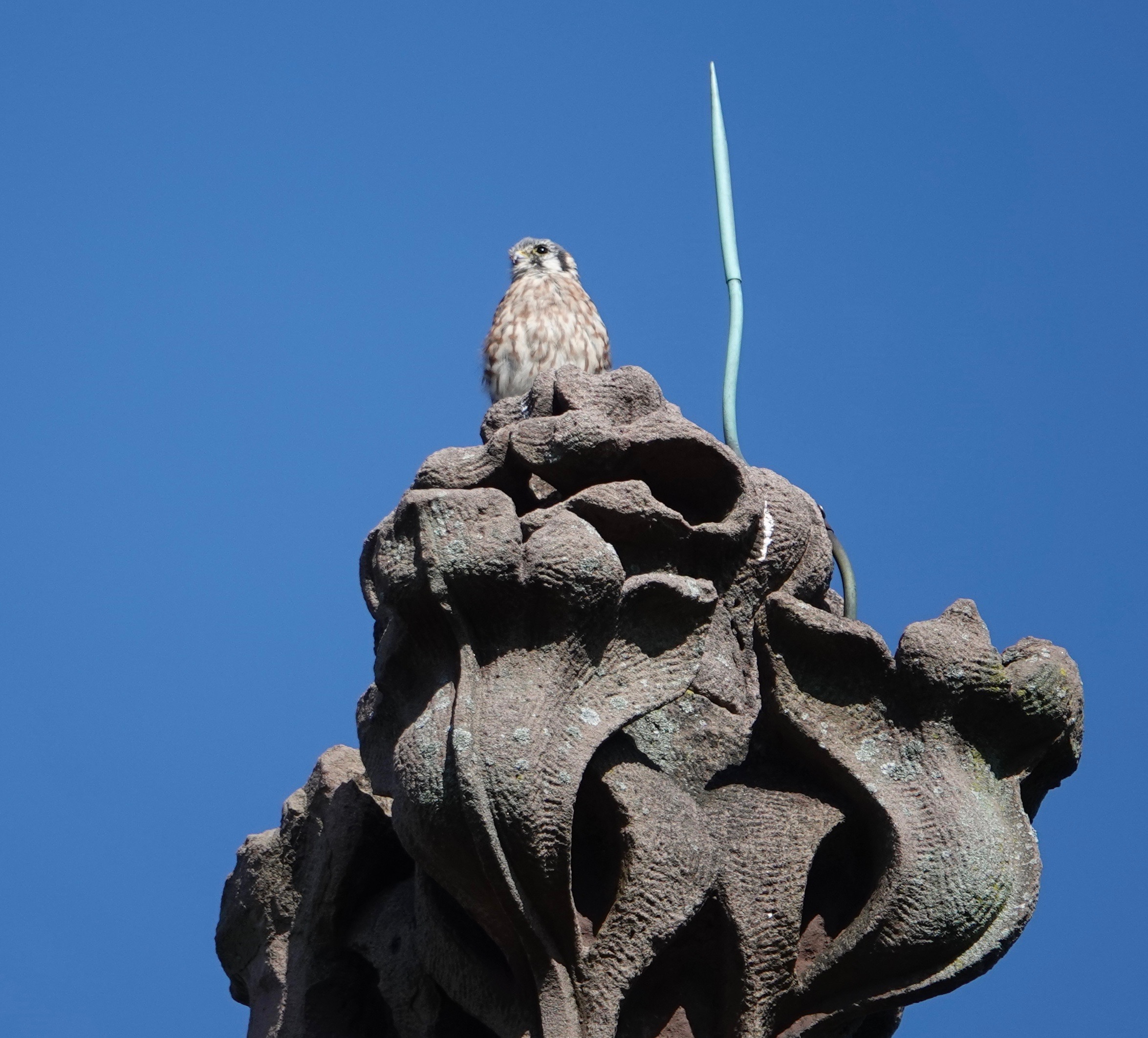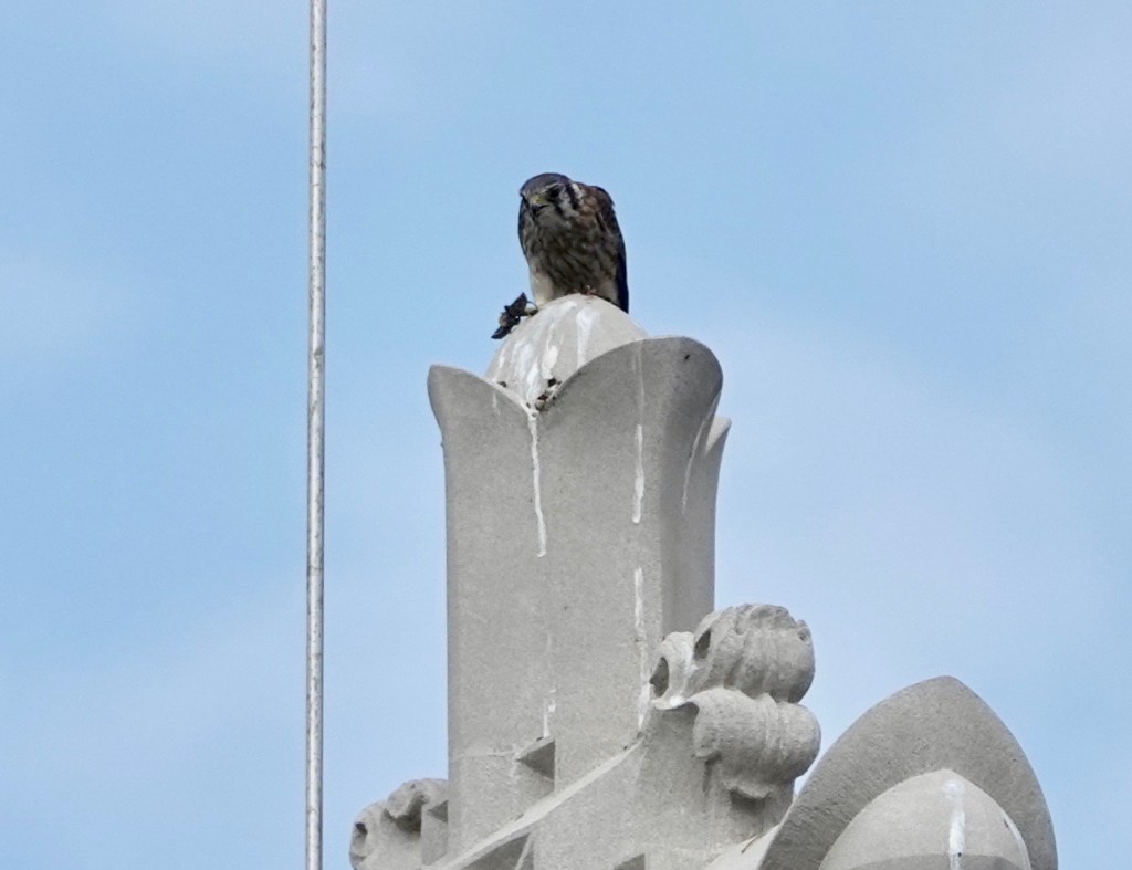 The point here is that the female American Kestrel up there saw a two-inch long grasshopper on the road and swept down to pluck it right up. She flew back up to the chapel top to dispatch it.