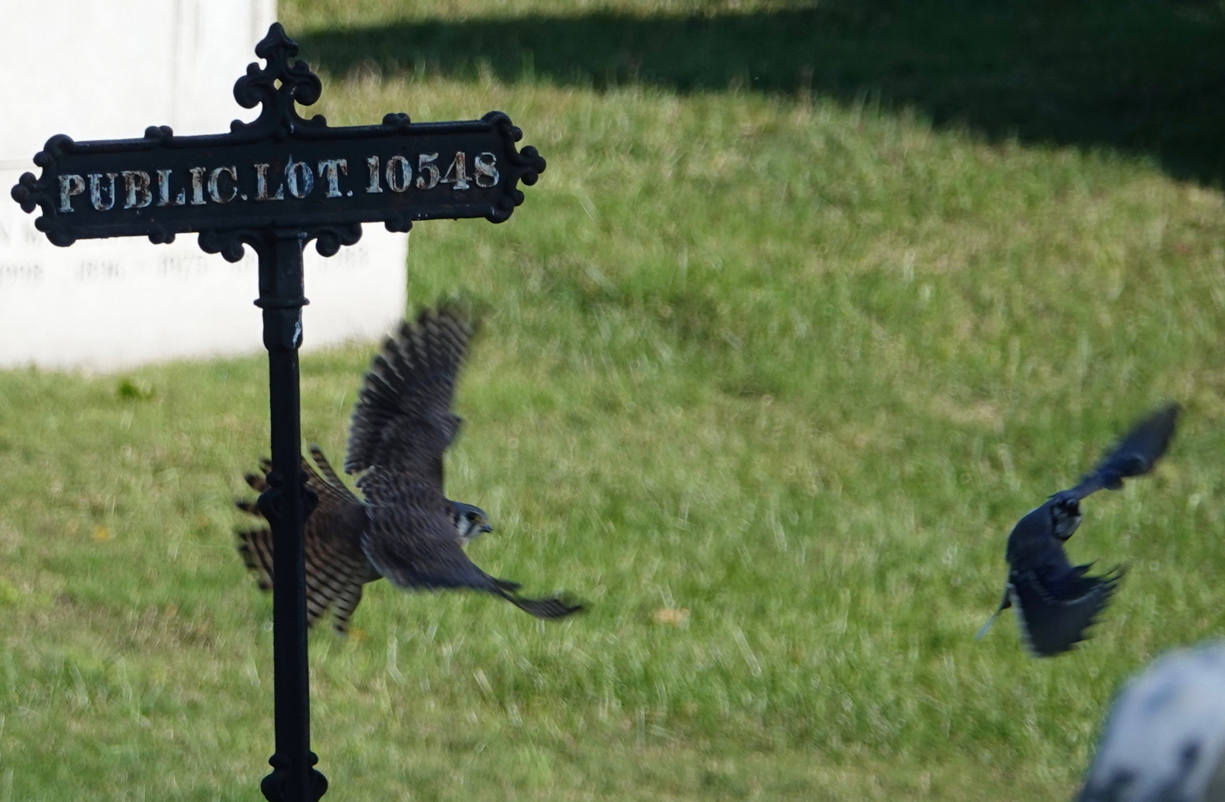A few minutes later, she was perched on this sign when one of the several Blue Jays policing her showed up close and personal.