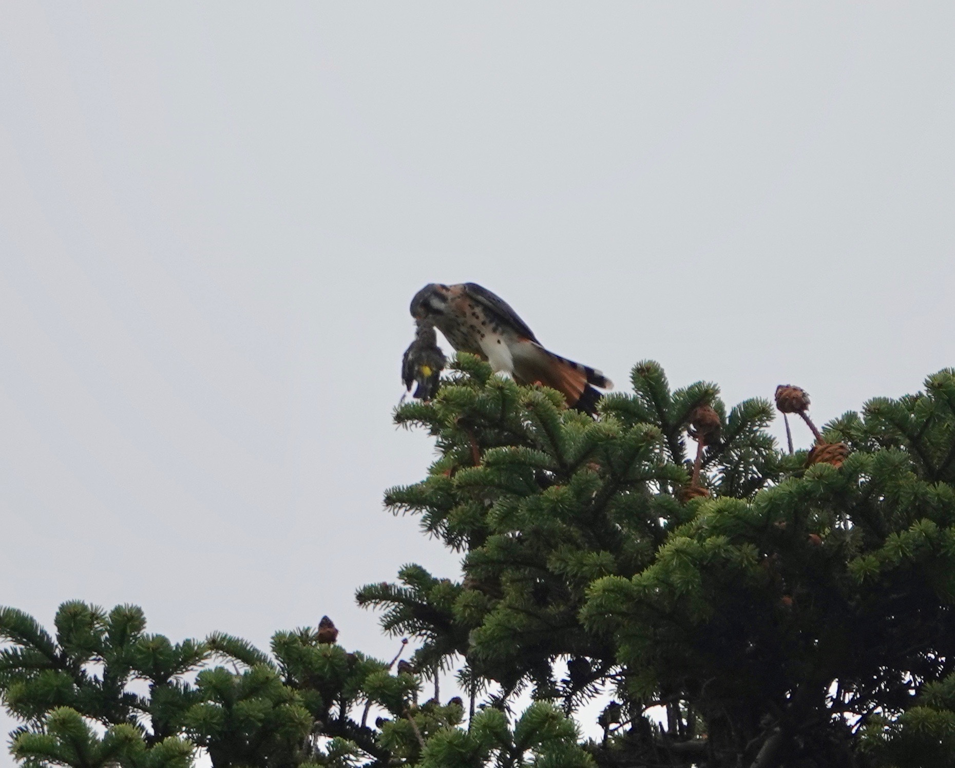 The bagpiper had just finished practicing, so the peace and quiet and nature sounds I came for were again all around me. The call of an American Kestrel had me scanning the skies. This bird flew up to the top of this conifer and, as I got some lens on the situation, I saw that he had lunch. The yellow rump and tail pattern point to Yellow-rumped Warbler.
