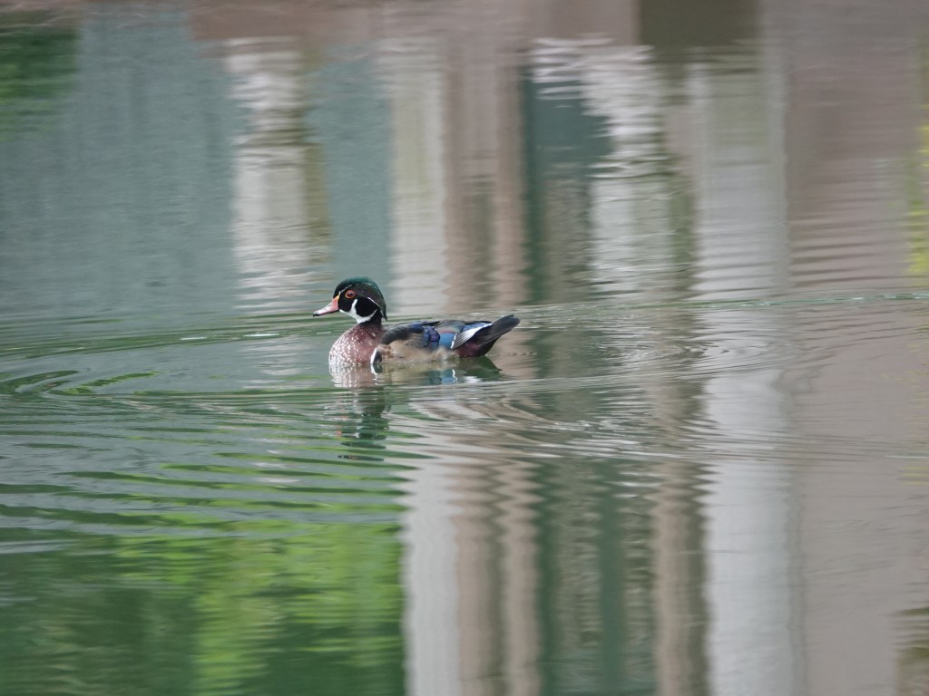 I’ve mentioned the weeping Bald Cypress on the edge of Sylvan Water before. It provides excellent cover for bathing birds, who can dart into its shelter when they must. As the low tree reaches over to cover a bit of water, it also provides a hidey-hole beneath. The reflection of a Wood Duck in there, for instance, can be seen above.