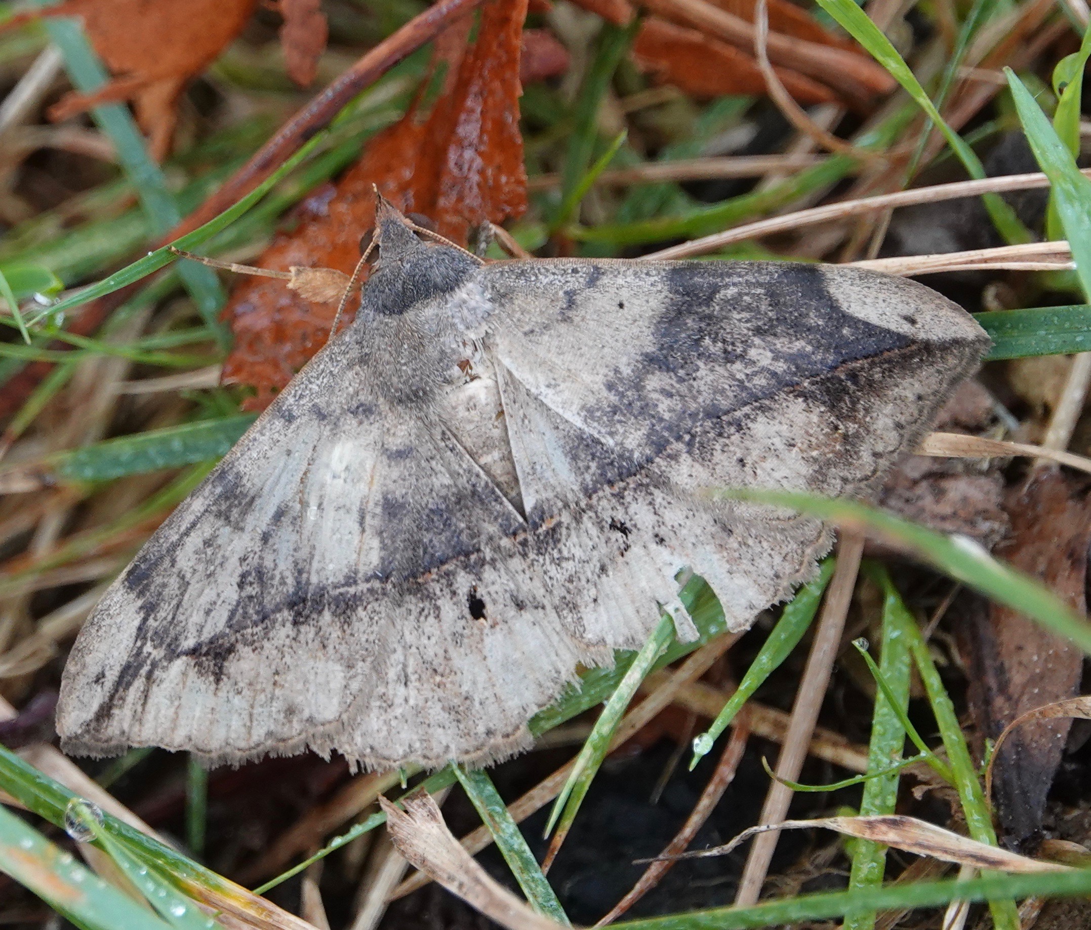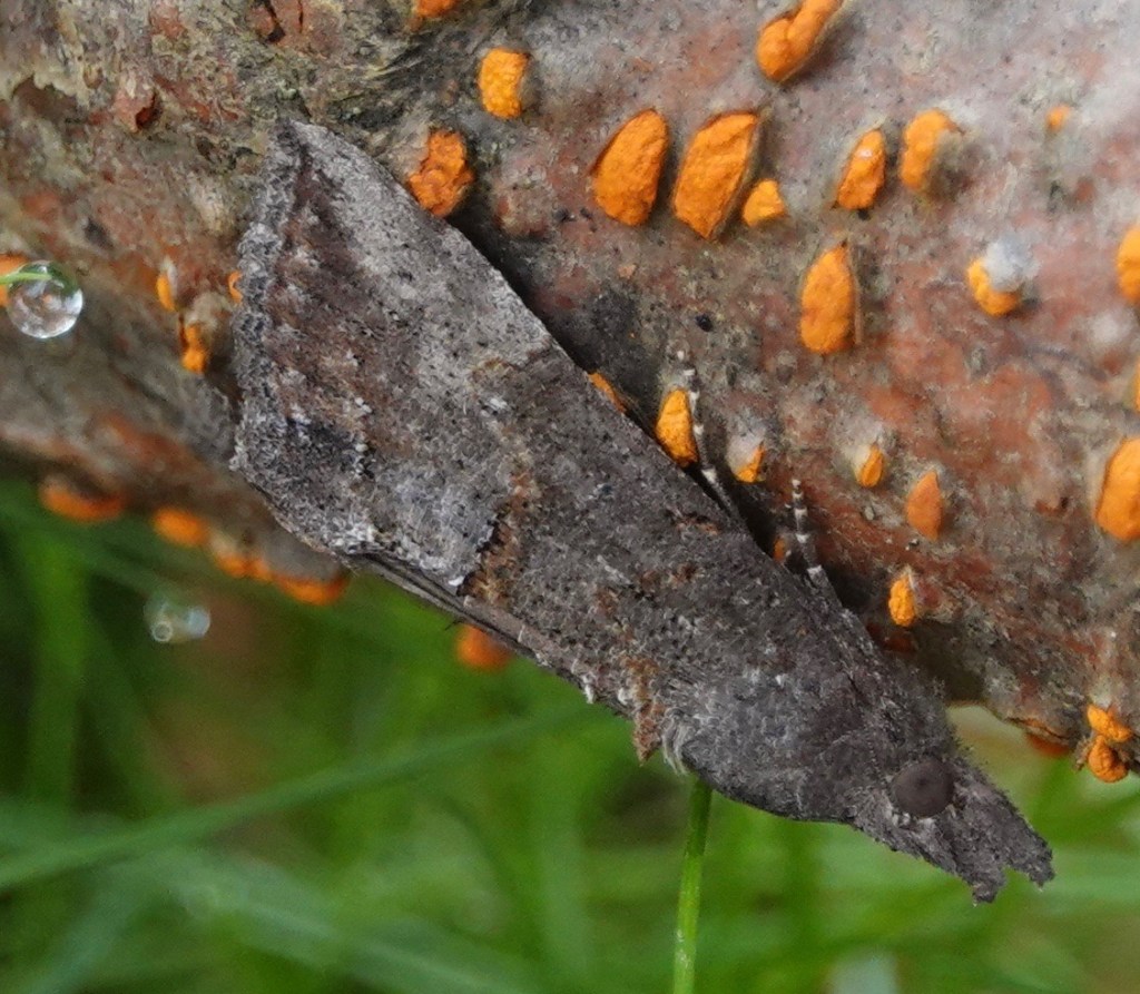 The ubiquitous Green Cloverworm Moth (Hypena scabra), posed against some Orange Hobnail Canker on a twig. This moth is quite variable, with much lighter versions.