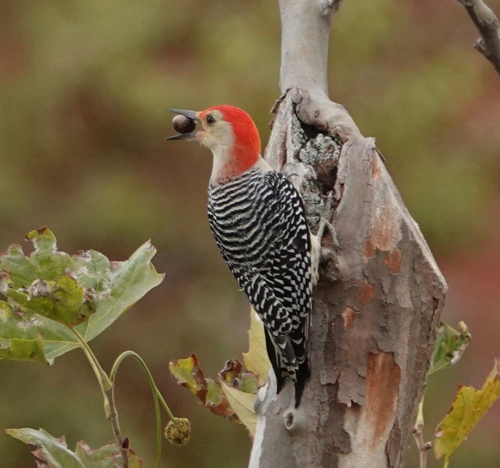After this bird stored this acorn inside, with what seemed to be some care, another Red-bellied flew into the tree and chased this one off. Are they fighting over the cache?