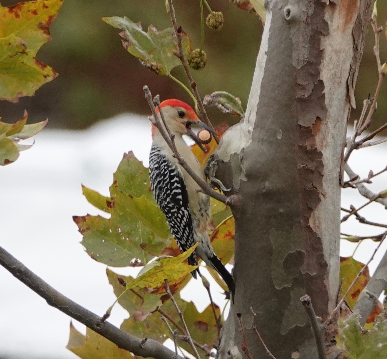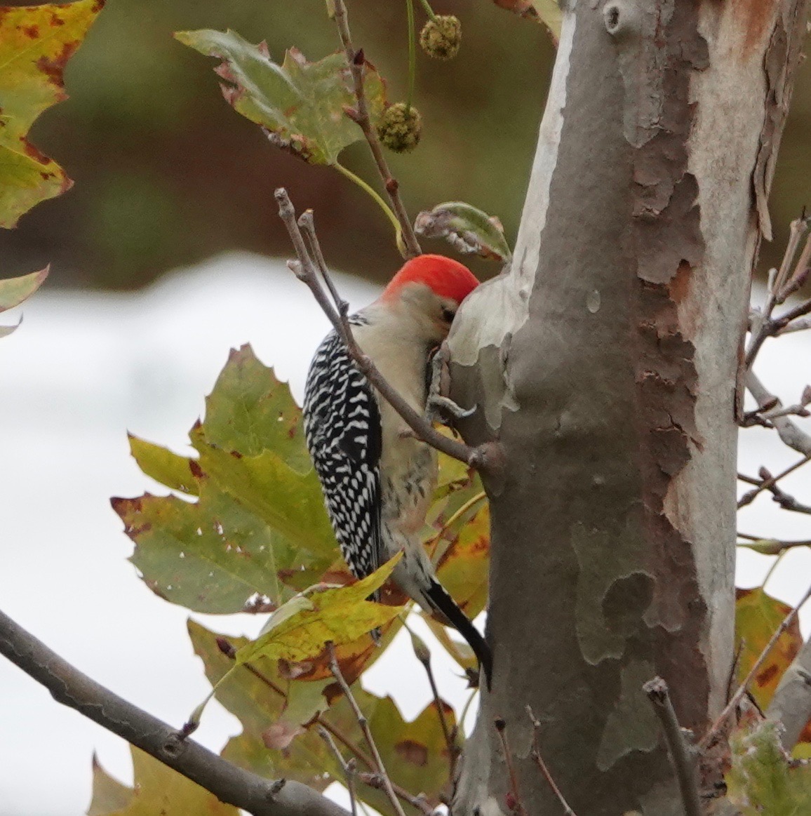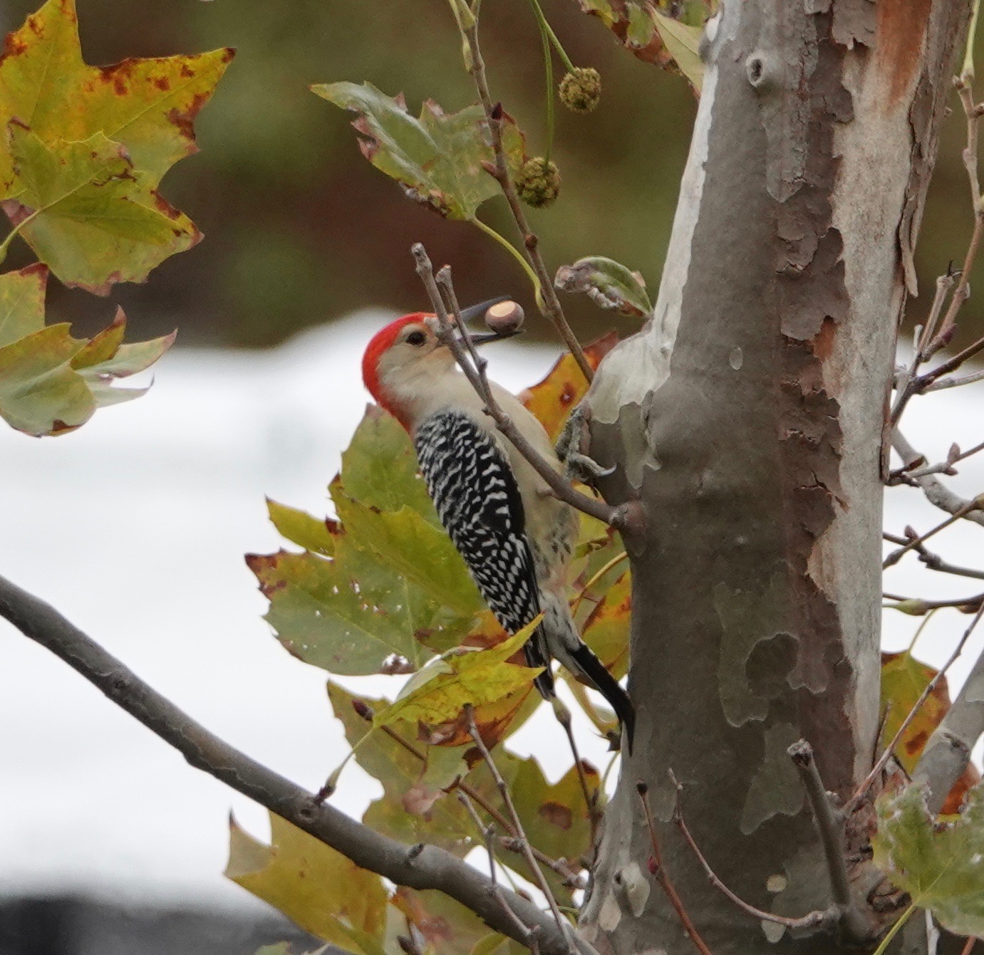 For days now, a Red-bellied Woodpecker has been heard in the London plane tree across the street. The distinctive “quirrr!” announces his bird. But he doesn’t stay long. I hustled to the window with the camera a couple of times before just staking out the situation to catch these images.