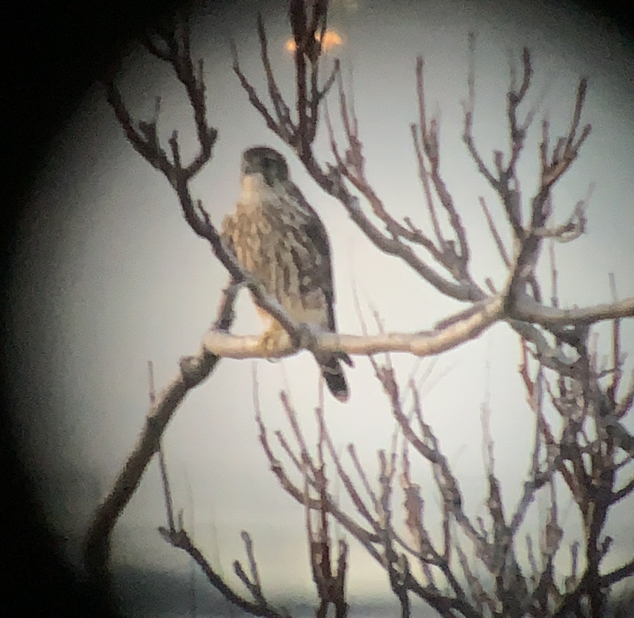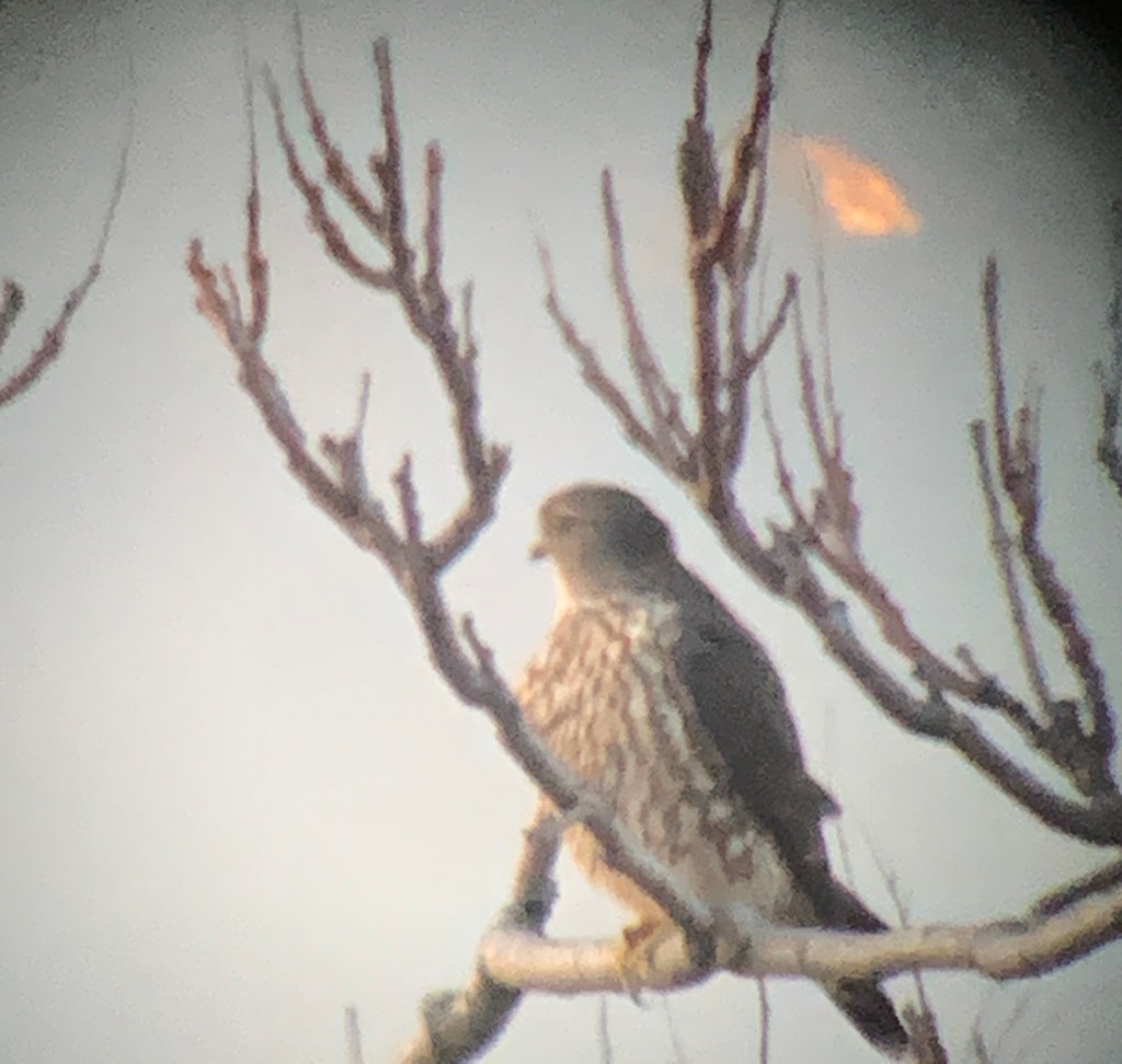 While the Kestrel was on the chimney pot, a vocal Merlin flew up to the bare ailanthus behind the solar building, something like 100 feet from the chimney pot.