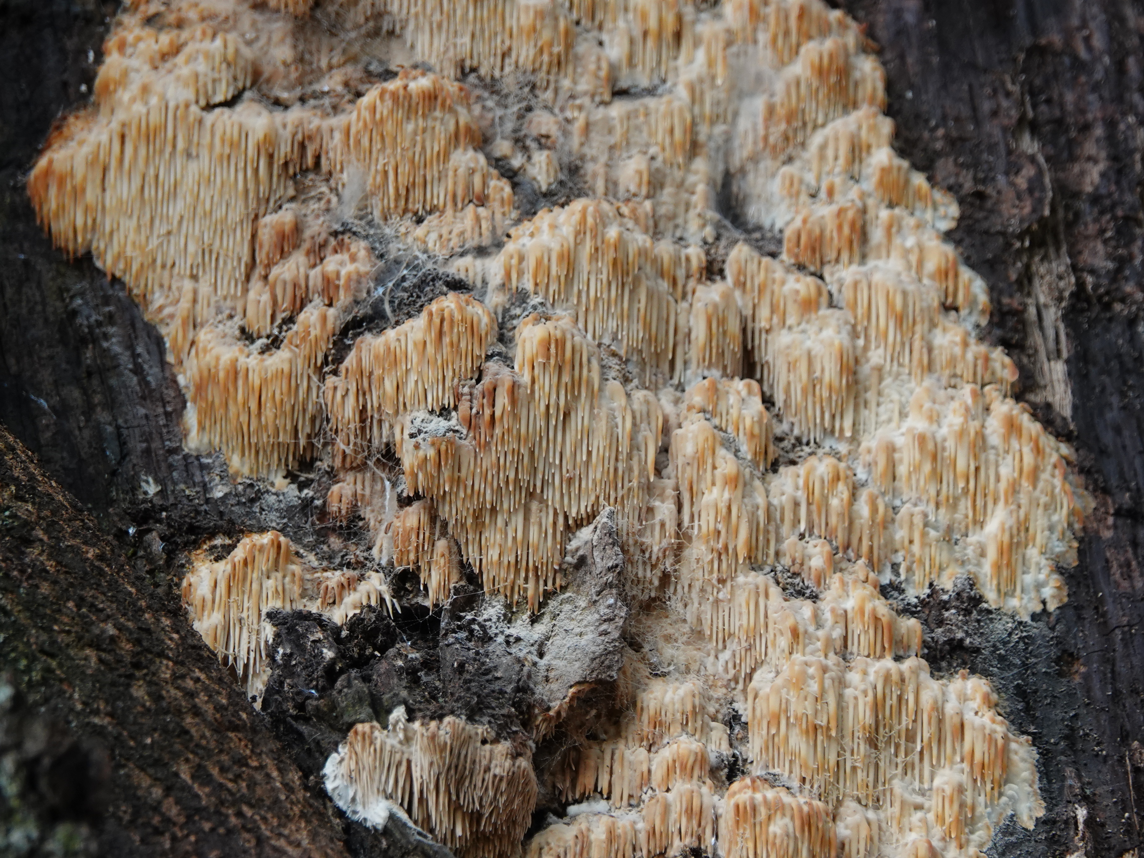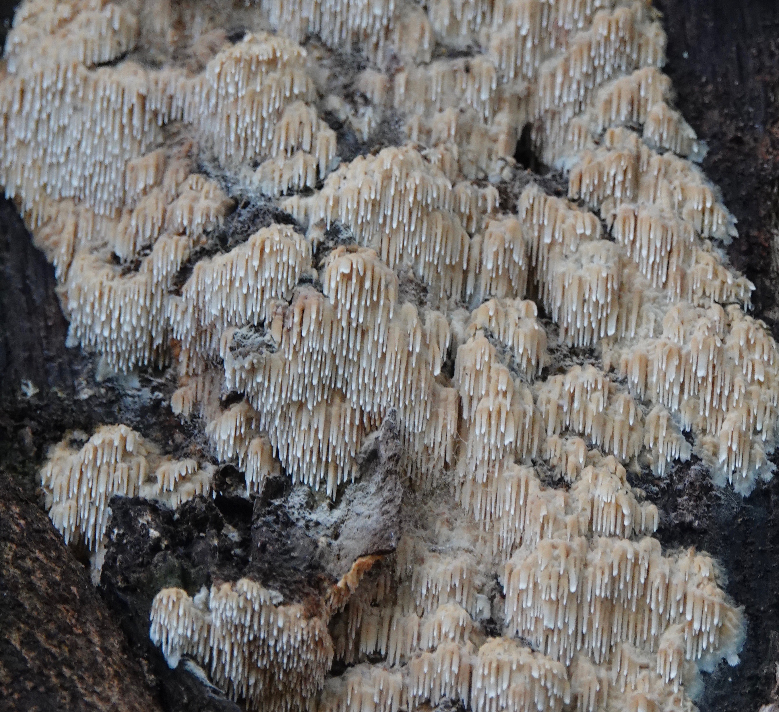 This was too high up, on a dead part of a big red oak, to get a better photo, but damn, isn’t it amazing? The Asian Beauty (Radulomyces copelandii) fungus is a recent introduction from Asia, with the first East Coast records in Massachusetts only from 2011. It seems to be moving fast. The Japanese name translates as “Hanging Needle Mushroom.”