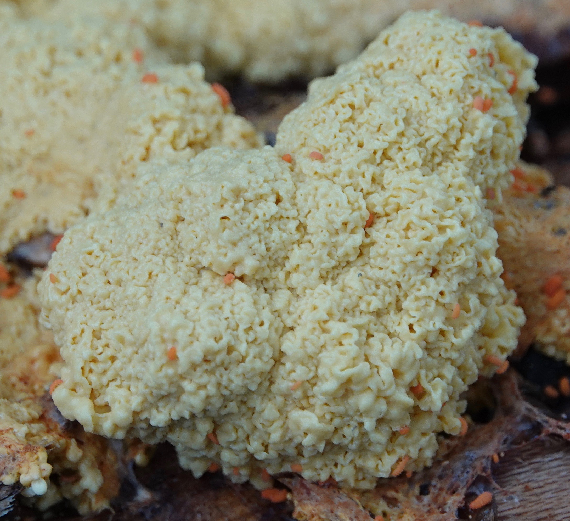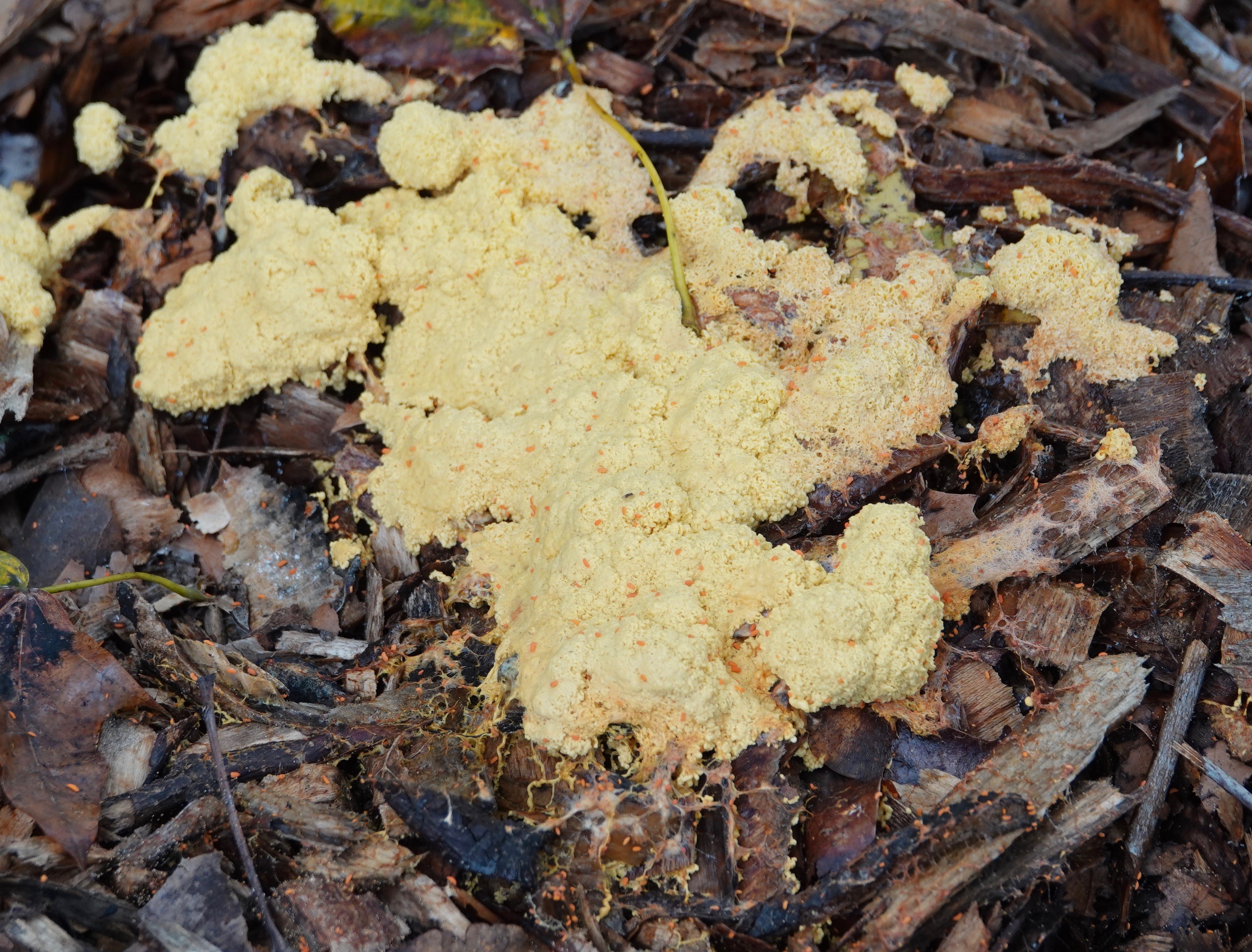 Something that could use some caramelization? This is a slime mold, perhaps a Mucilago, on a wood chip pile. Scrambled eggs or dog vomit? Dog Sick Slime Mold is a contender for the ID here, actually.