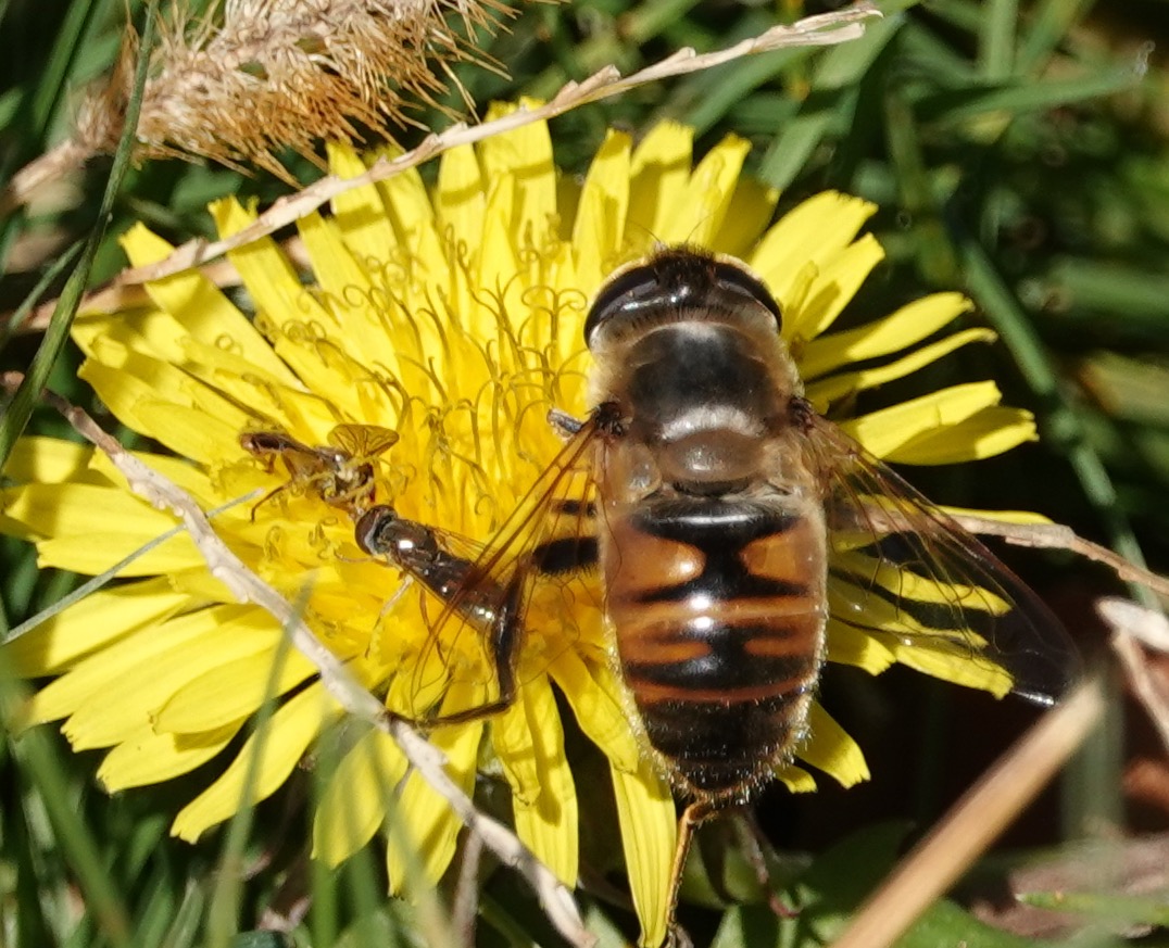 There is very little pollination real estate available out there now. It being past middle November and all. This dandelion flower, the only blooming flower visible, was crowded with two Margined Calligrapher flies and a Common Drone Fly the other day.