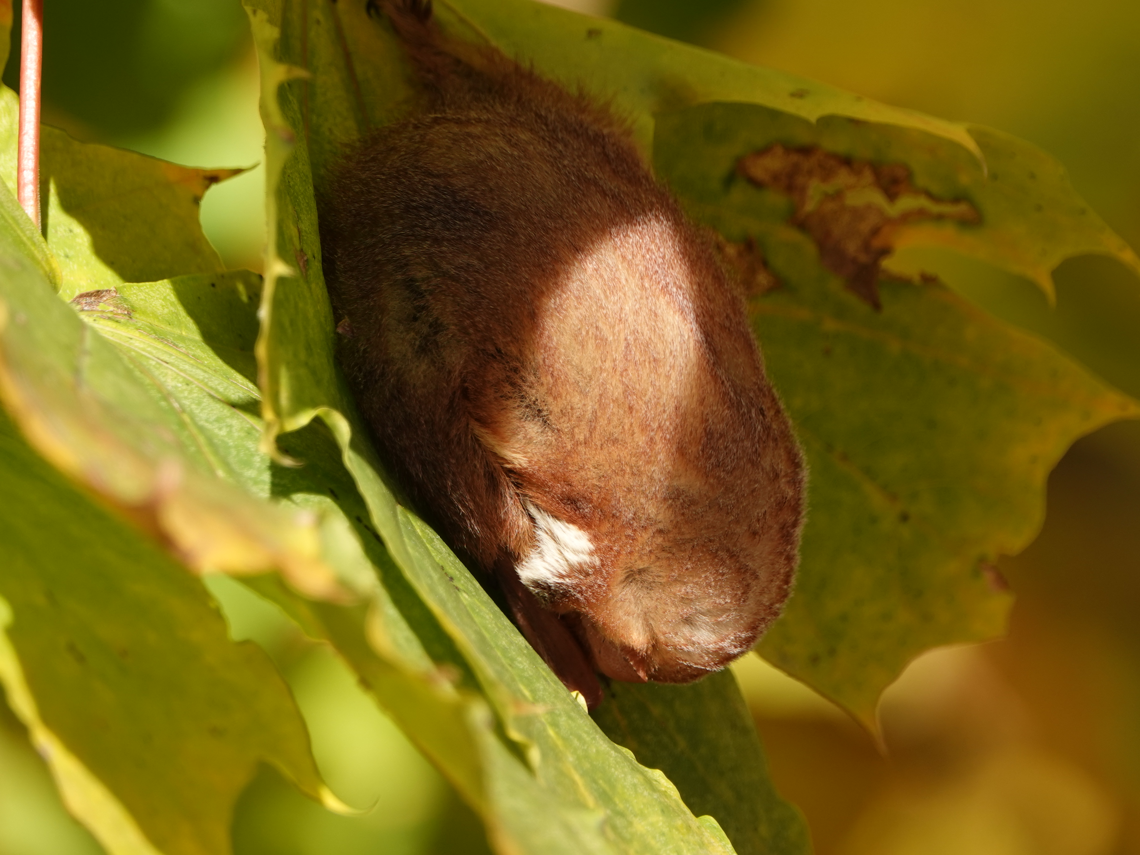 A Green-Wood gardener called my attention to two Eastern Red Bats hanging from maple leaves in the cemetery last week. These were at eye level. Who knows what was further up…. Looking like old leaves or rotten fruit/cones, this is their day camouflage.
