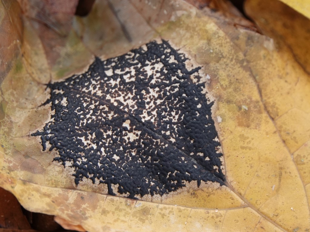 These, however, are examples from right here in Brooklyn. This is Black Tar Spot (Rhytisma acerinum), an ascomycete fungi. It’s cosmetic, not existential.