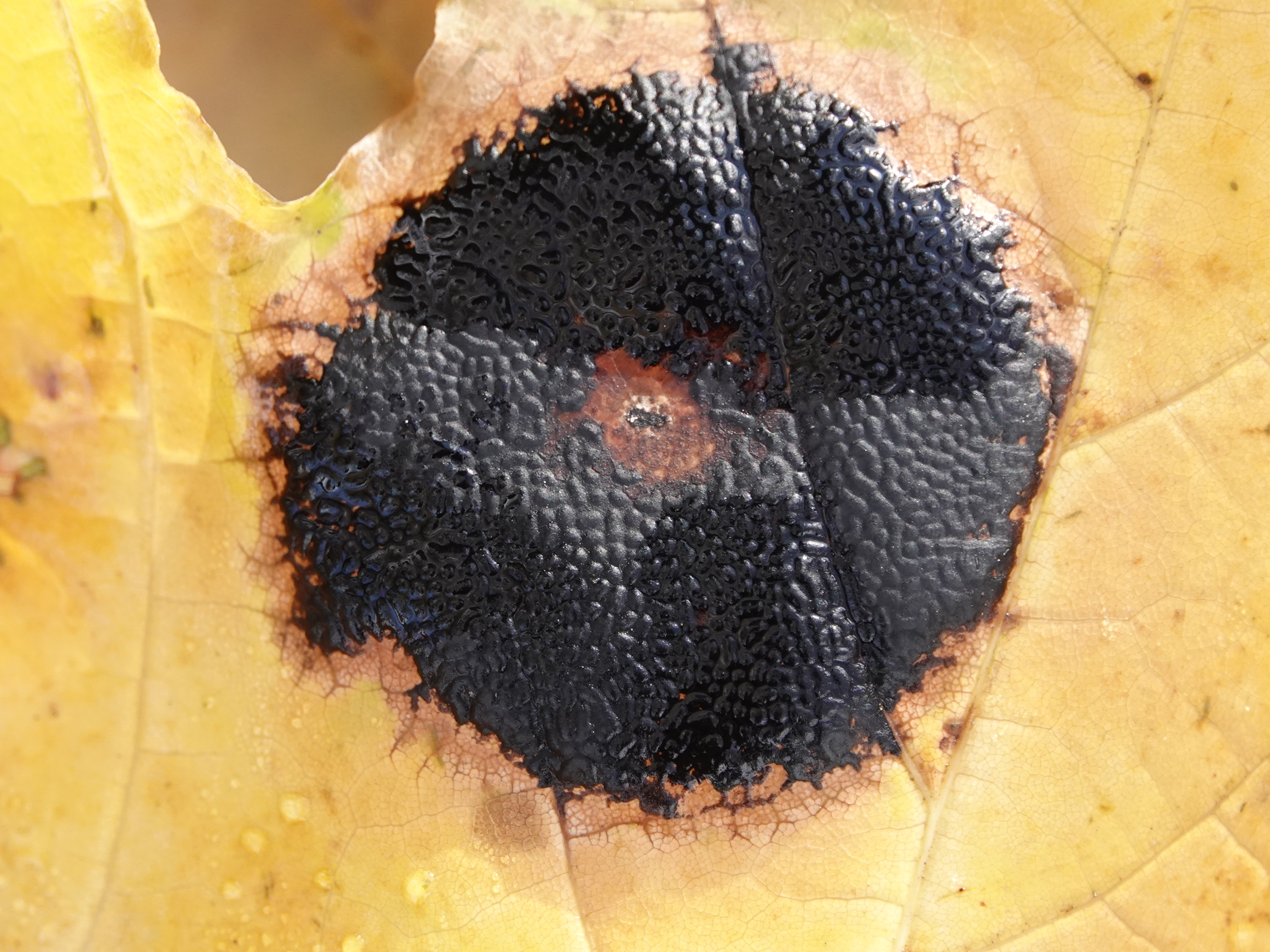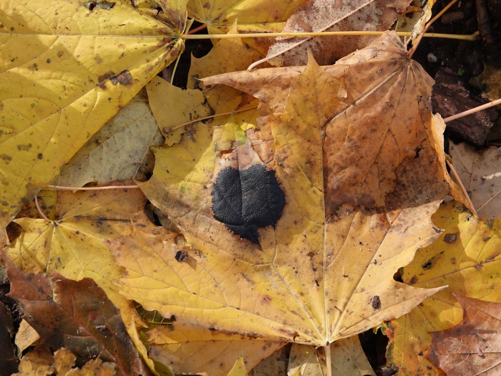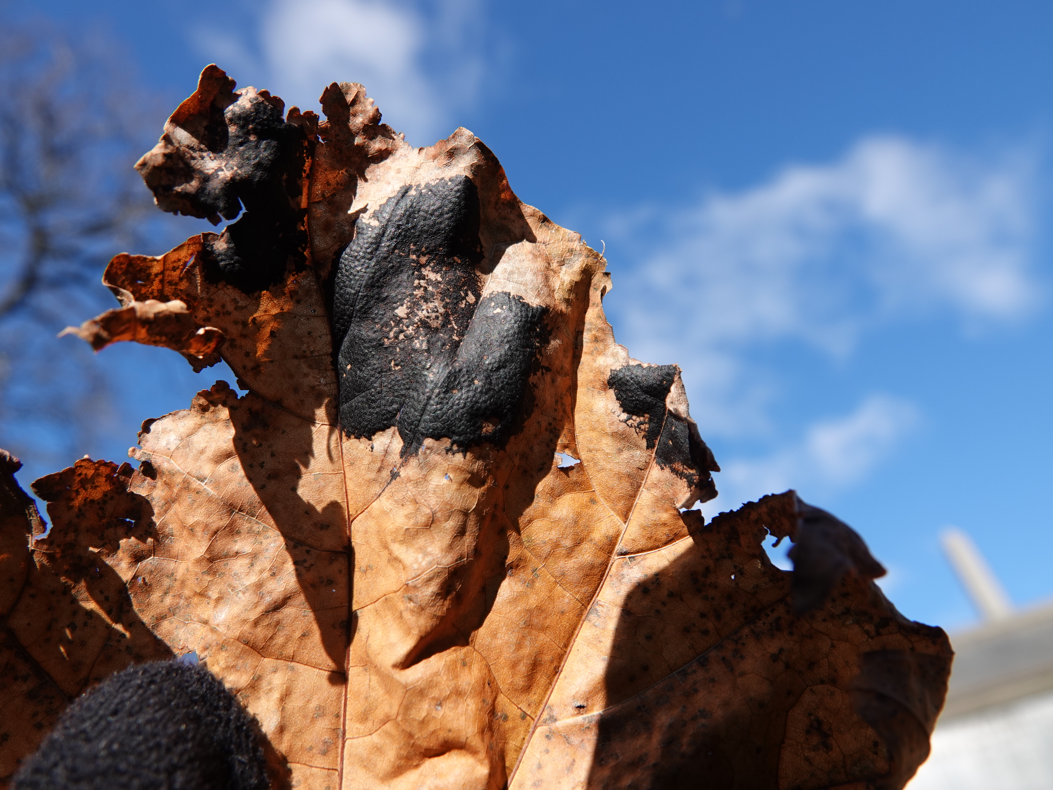 These, however, are examples from right here in Brooklyn. This is Black Tar Spot (Rhytisma acerinum), an ascomycete fungi. It’s cosmetic, not existential.