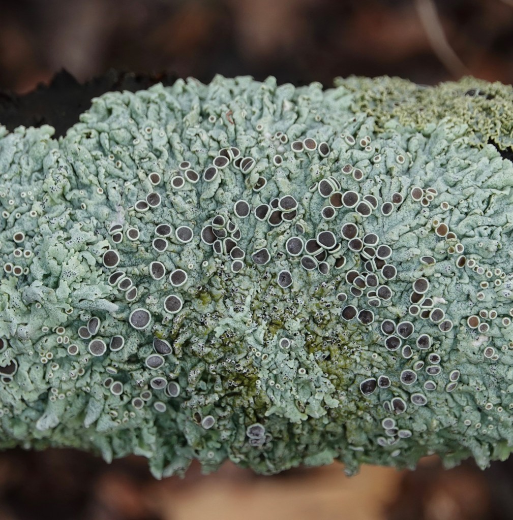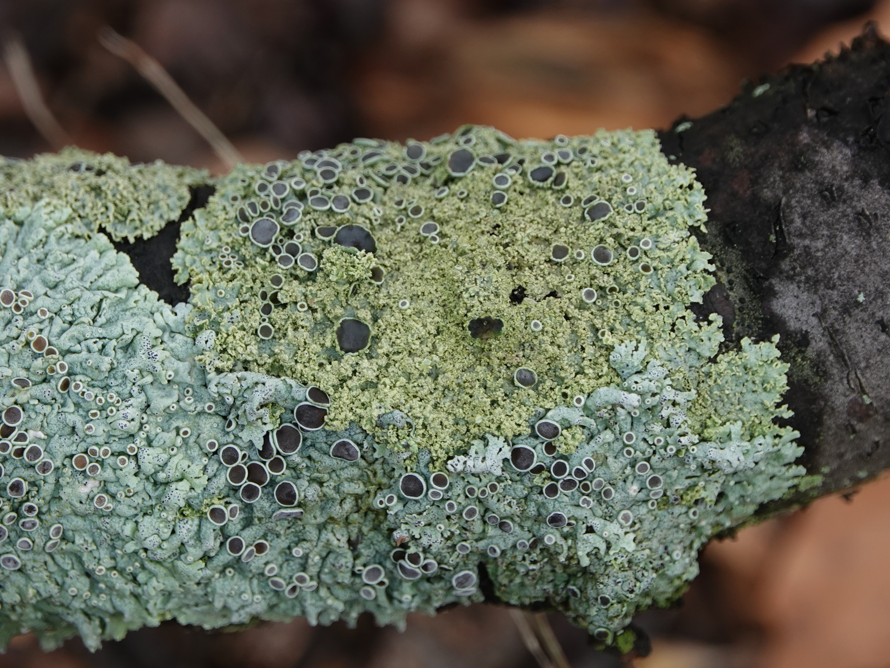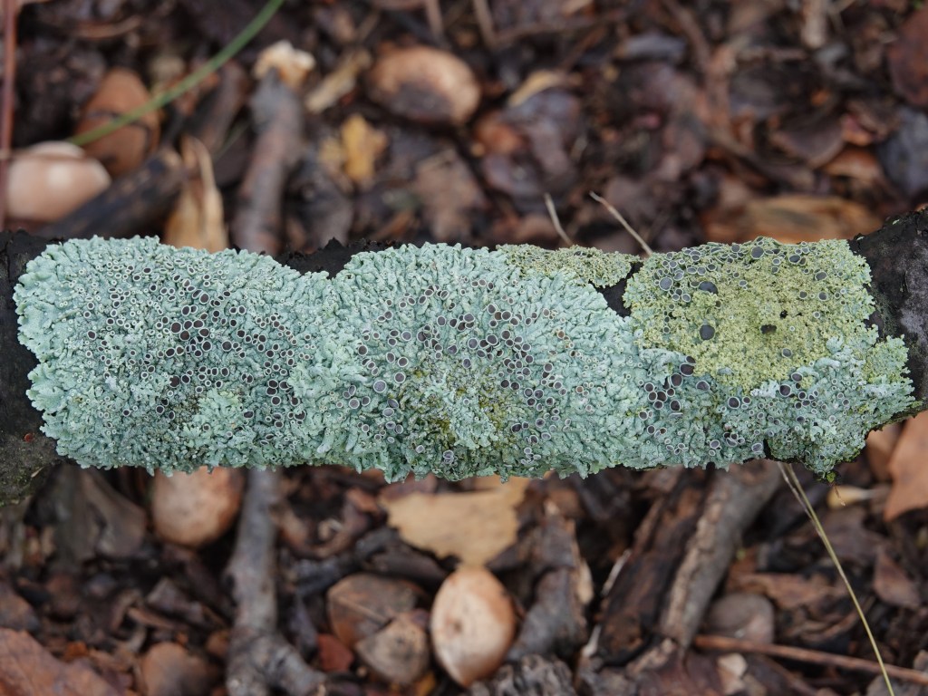Always take a look at the sticks and limbs that come down from old trees. There’s a lot of stuff going on up there, out of sight, and breakages provide a great opportunity to see what. This piece of an oak has at least two nice lichens on it.