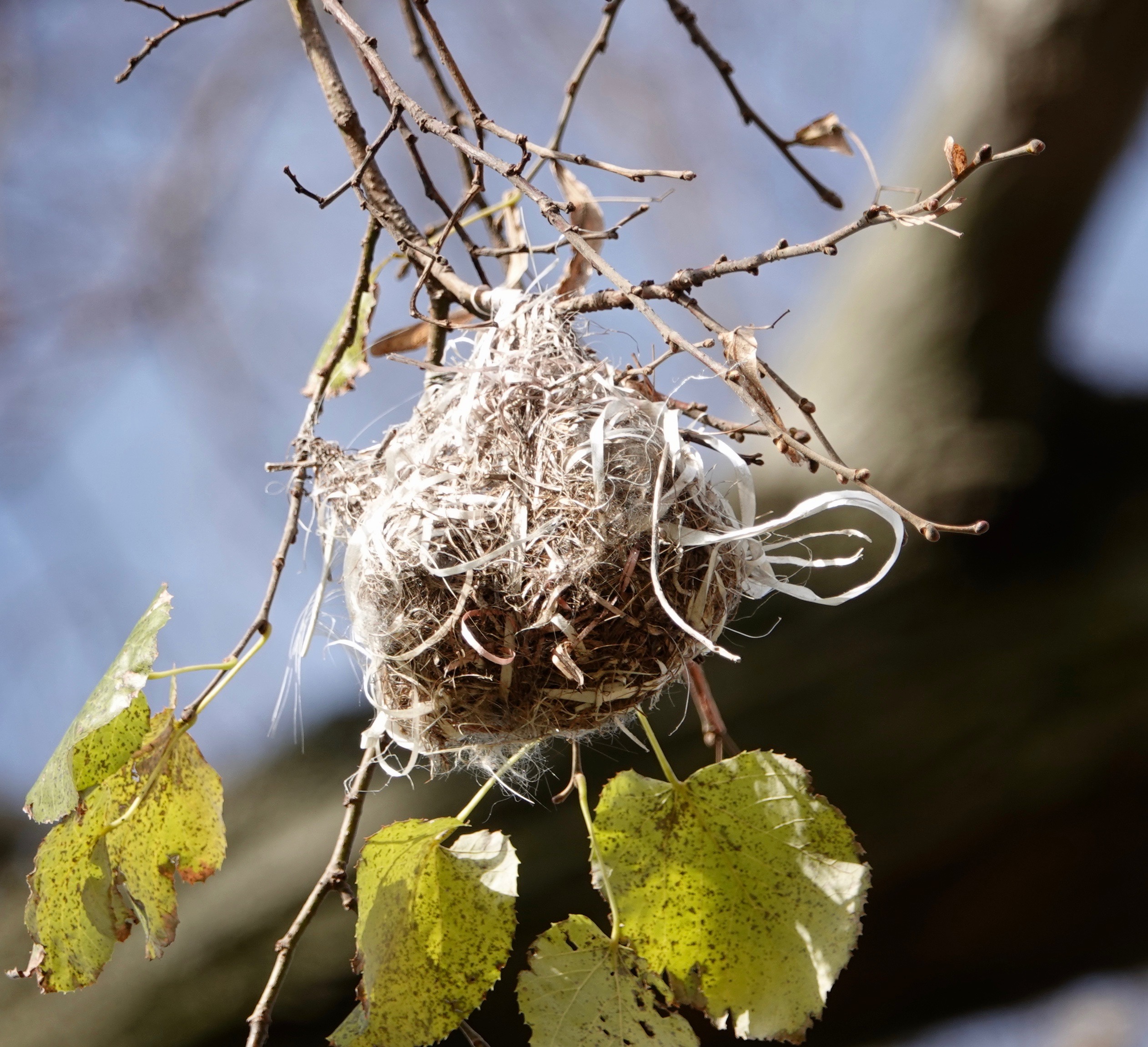 A Baltimore Oriole nest left over from the summer. High up in a linden. So much ribbon! But then, this is a cemetery, and balloons (boo!) and flowers bouquets (inimical to nature in their own way) come tied.