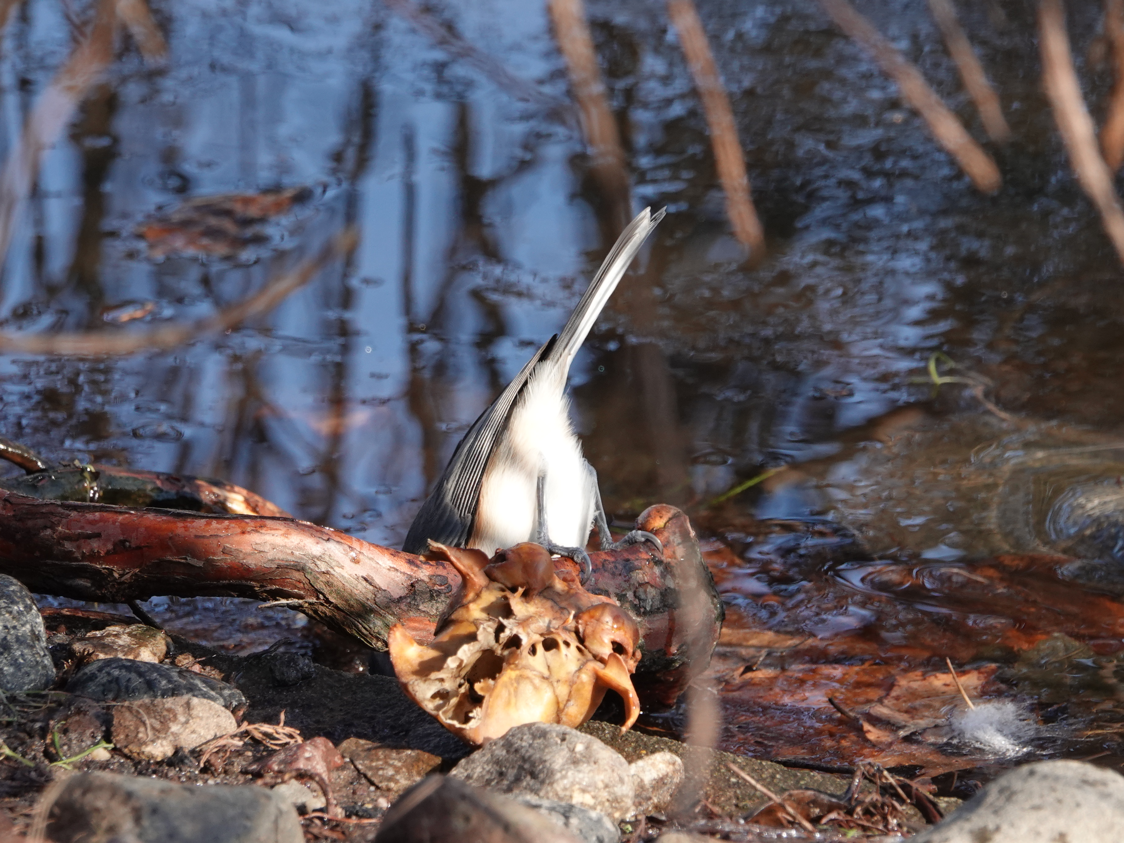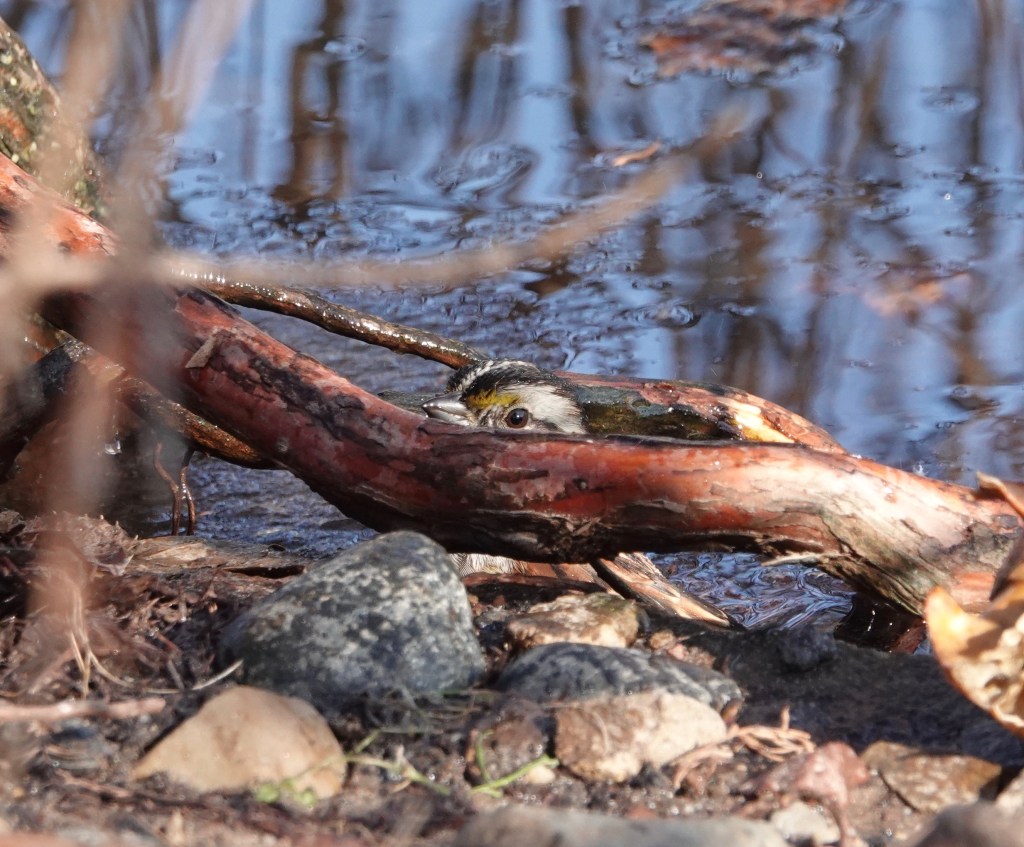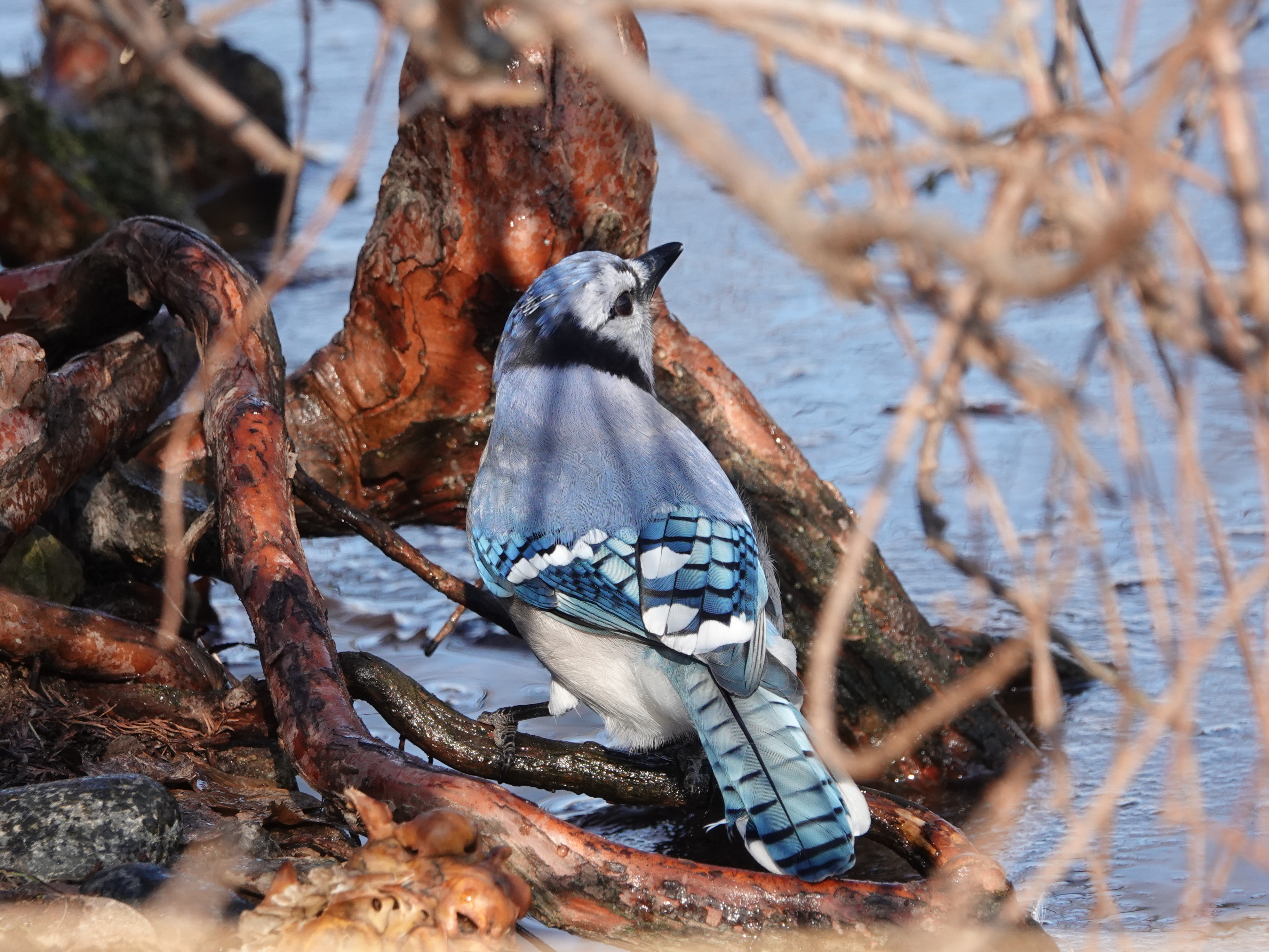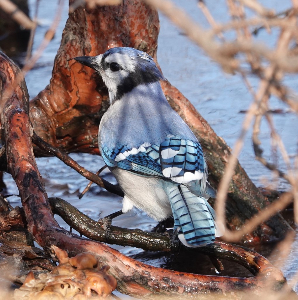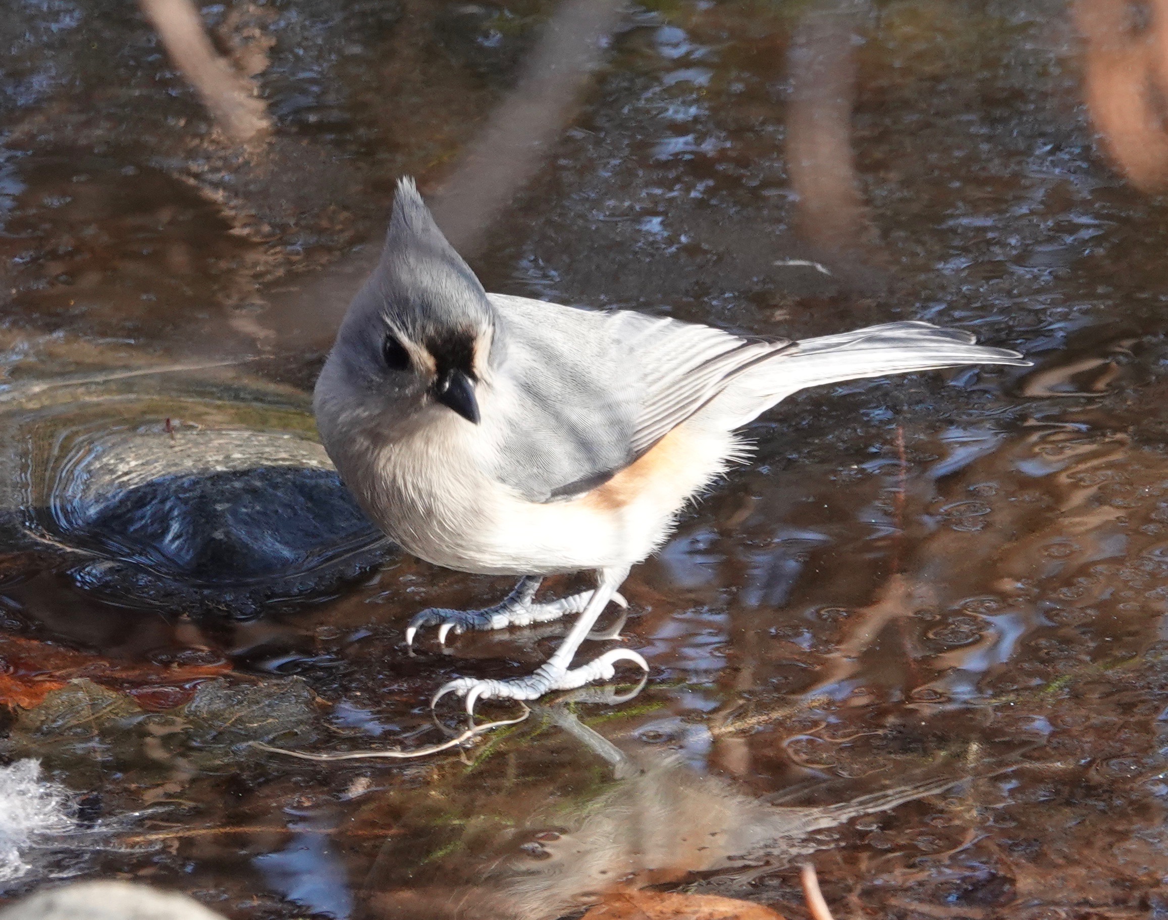Back in October I spied on the birds bathing under the little weeping variety of bald cypress by the Sylvan Water in Green-Wood. The other day the pond was mostly iced-over. But under the overhanging branches, a small opening was calling. And Tufted Titmice, Black-capped Chickadees, Dark-eyed Juncos, Northern Cardinals, Blue Jays, and White-throated Sparrows were answering.