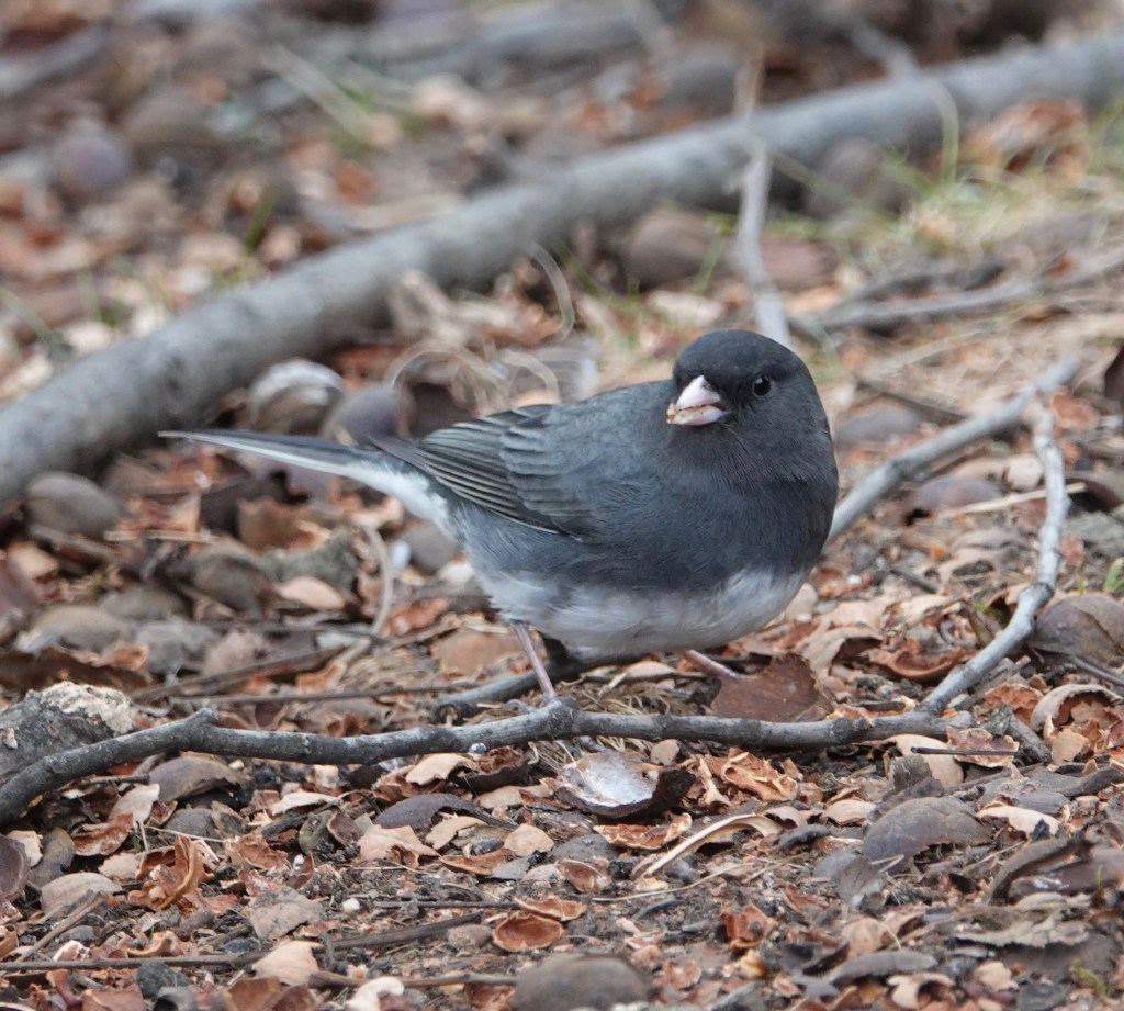 These two Dark-eyed Juncos were underneath a hickory tree that was absolutely littered with pieces of nut.