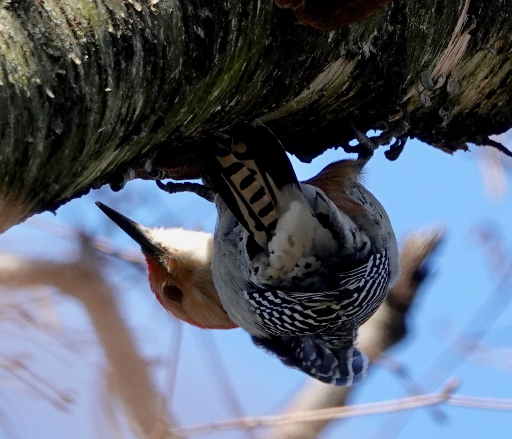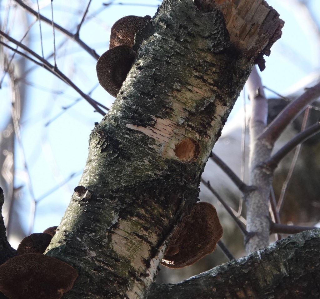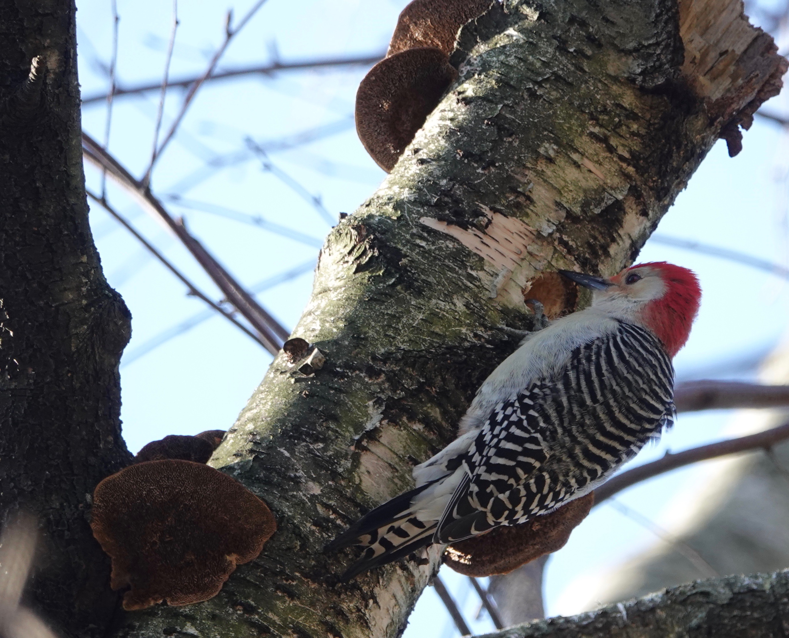 A broken branch of a wizened paper birch. I wonder if the bird knows to follow the mushrooms to the weakest wood? Seems a good bet.
