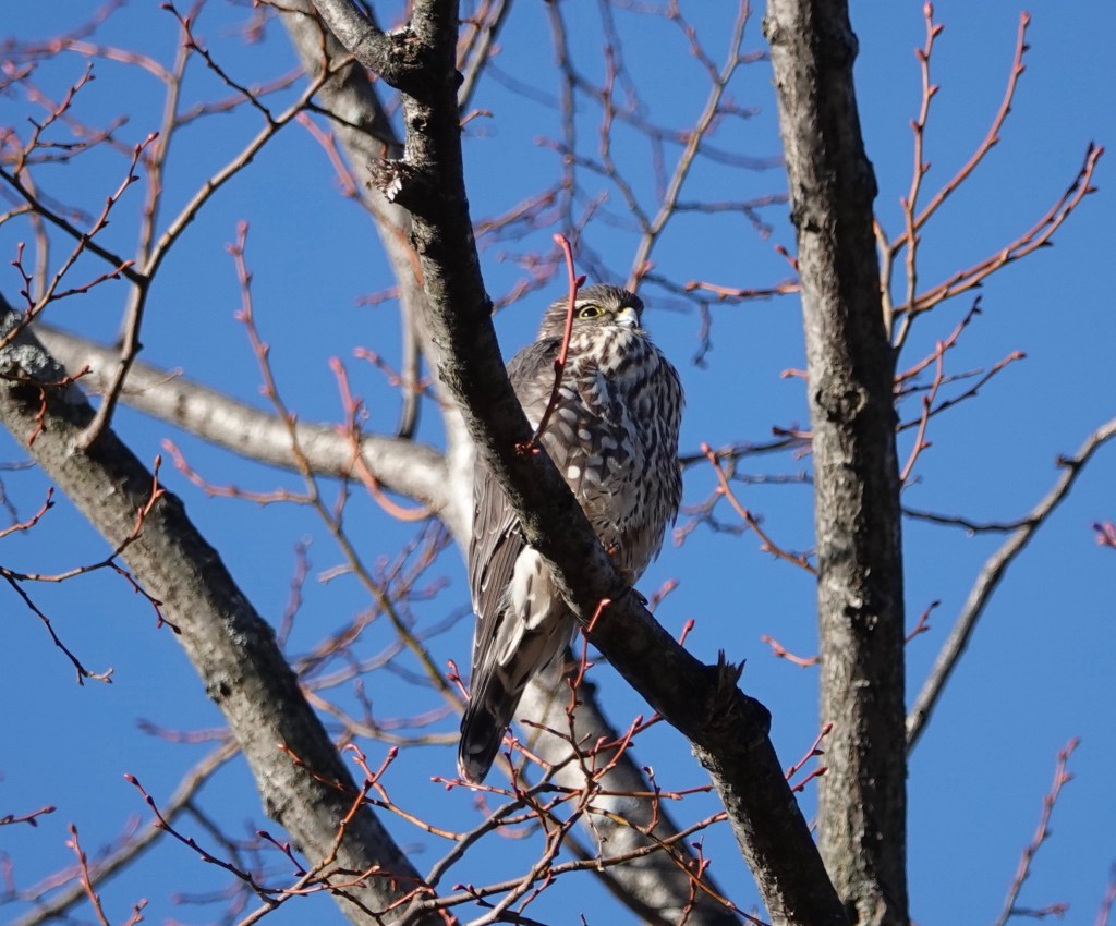 Same Merlin from the back. Those red zig-zag twigs? A linden.