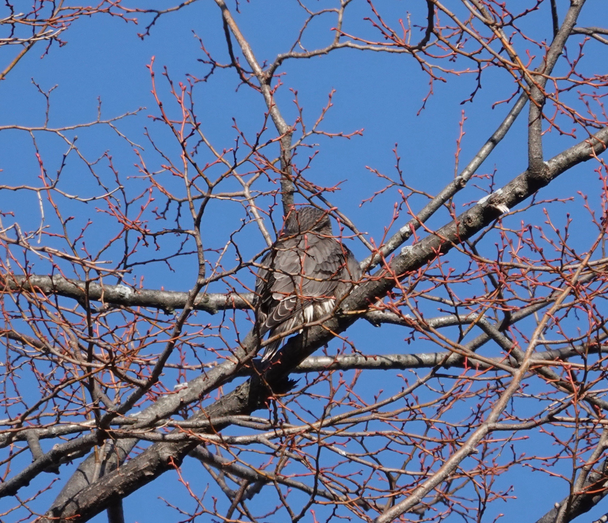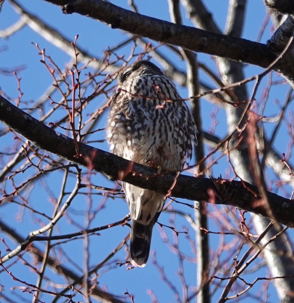 Same Merlin from the back. Those red zig-zag twigs? A linden.