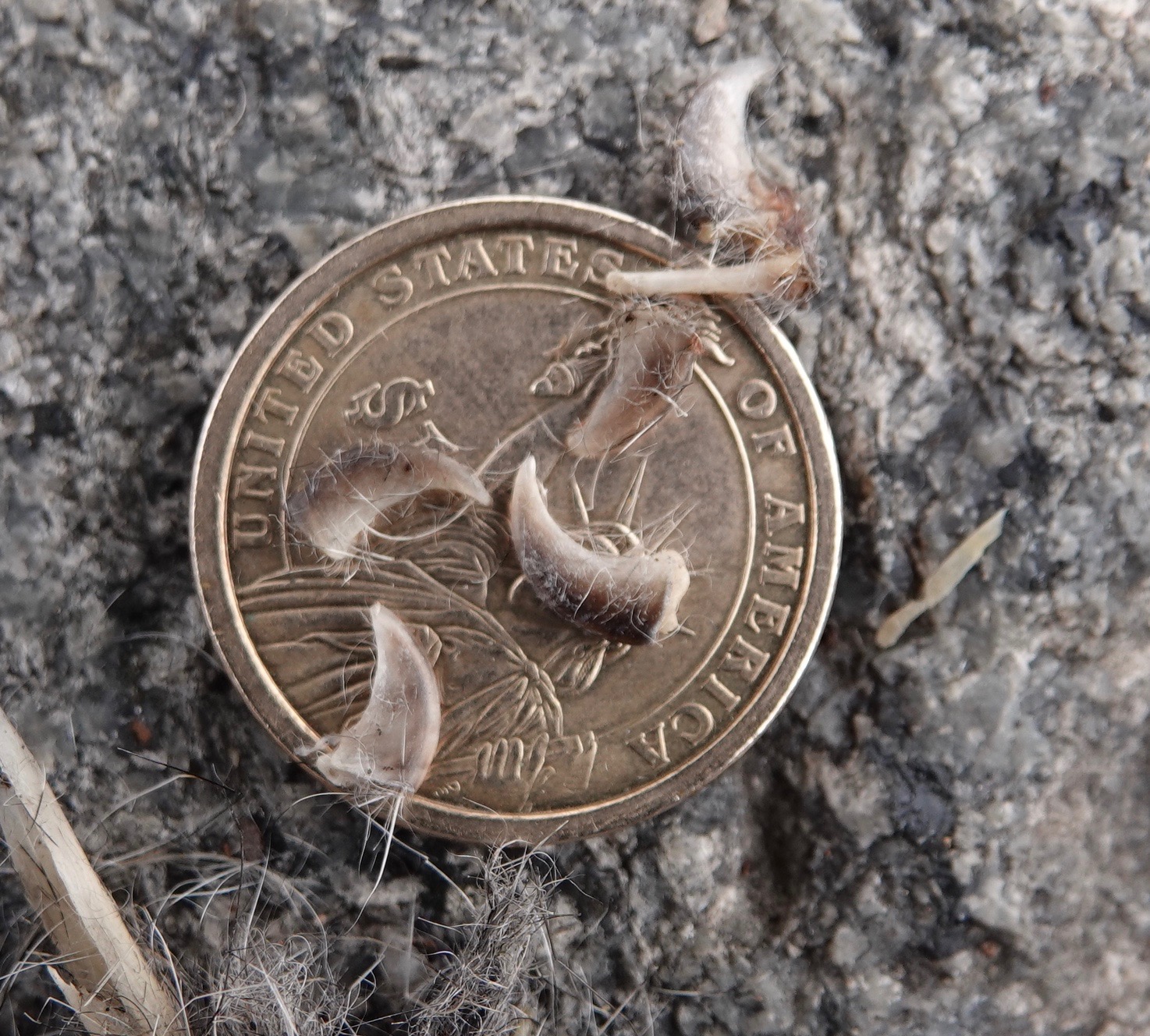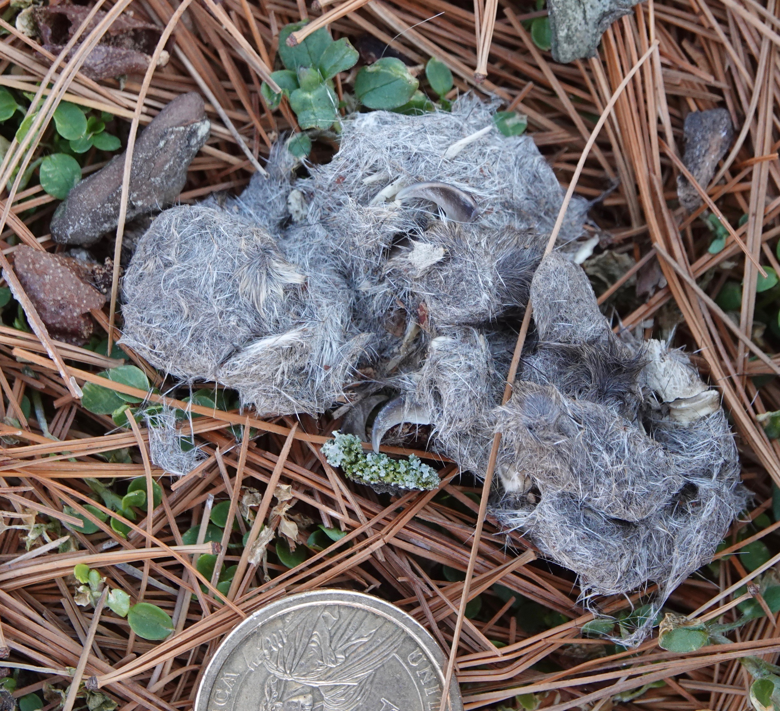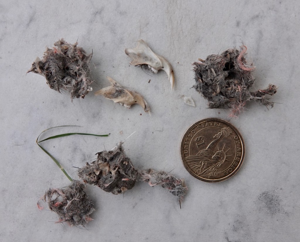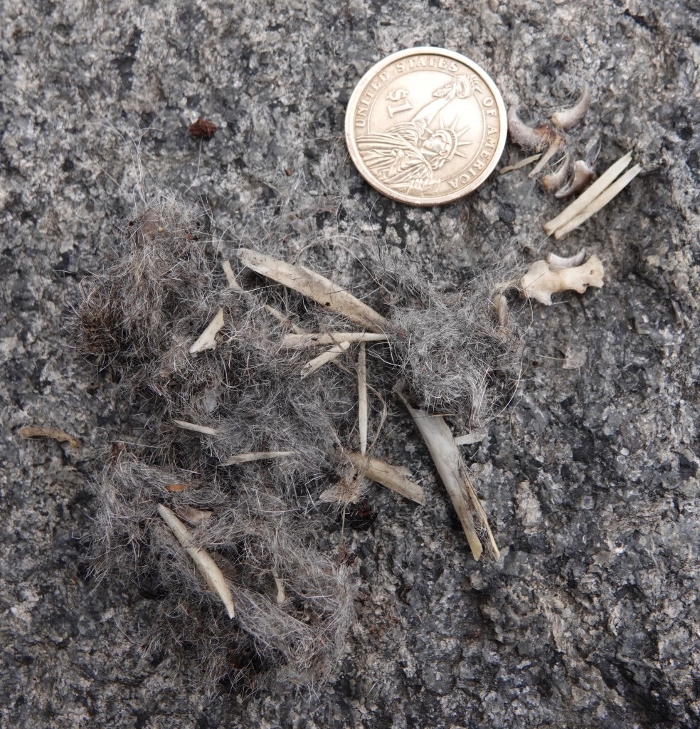 Also full of claws. Again, possibly rat. Owls tend to gulp their prey whole-hog, but I’ve seen American Kestrels and Cooper’s swallow the feet of their bird prey, tiny little toenails and all, business end up, meaning they go down the hatch with the points facing out.