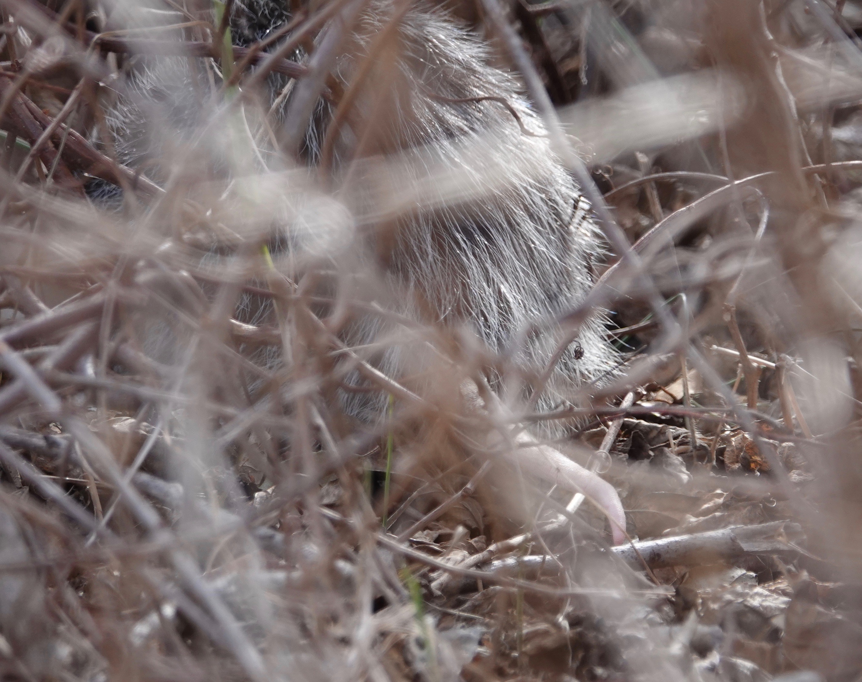 I heard this before I saw it. I thought the sound was sourced by White-throated Sparrows kicking dry, loose leaves out of the way as they foraged. My first glimpse of the light-colored fur had me thinking a feral cat was coming this way.