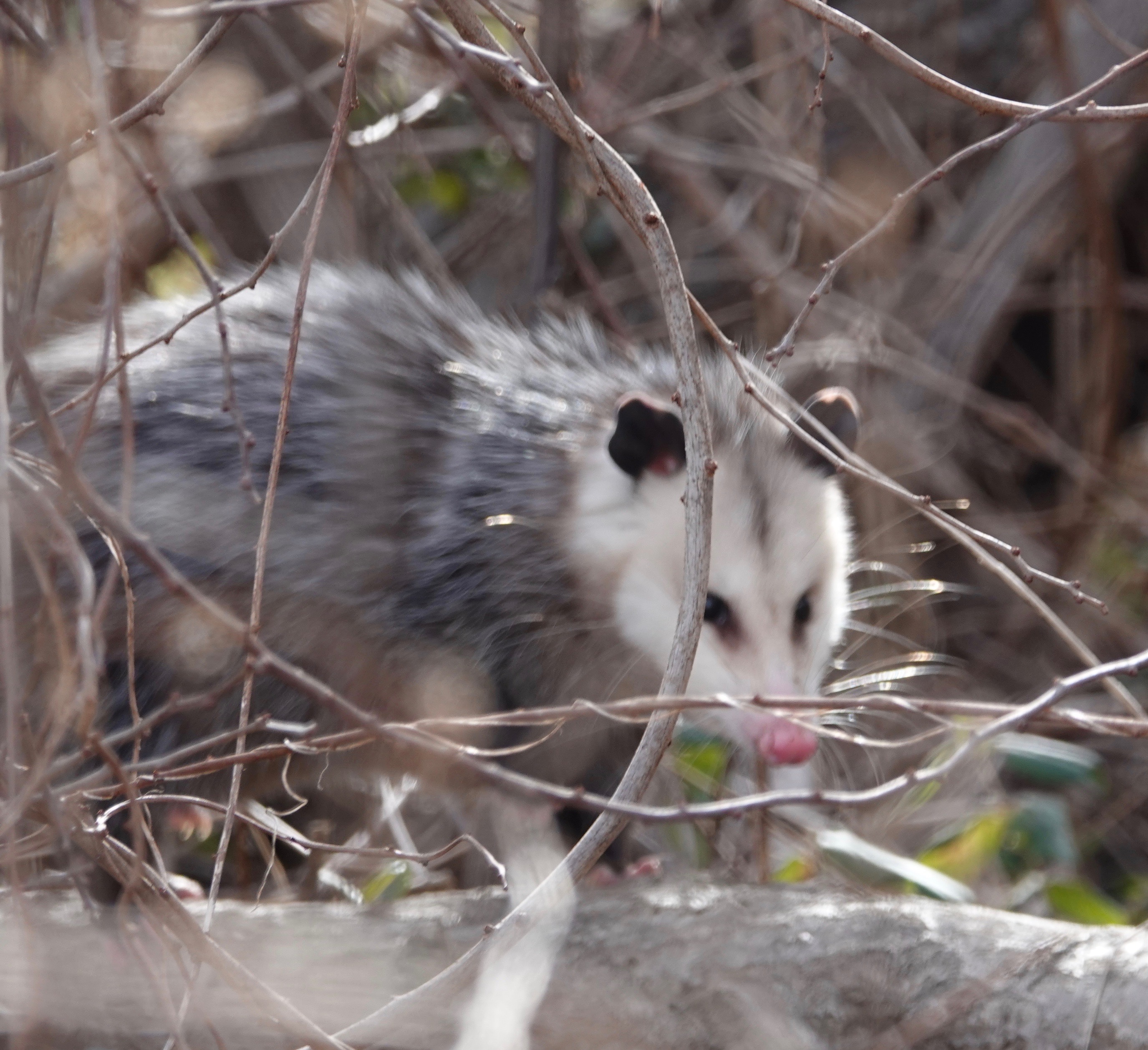But no, it was Didelphis virginiana. I think because I was already standing still, eye-balling the nearby Field Sparrows, this Virginia Opossum just carried on foraging for delicious opossum treats. That’s a broad category, “delicious opossum treats,” as they’ll eat almost anything: animal, vegetable, garbage. Big tick-vacuums, too, don’t forget, so let’s hear it for them!